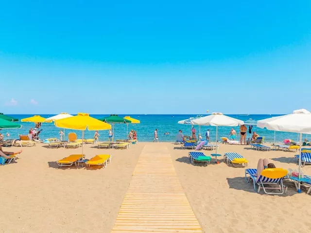 Piesočná pláž sa nachádza približne 350 m od hotela, pričom ležadlá a slnečníky sú za poplatok.