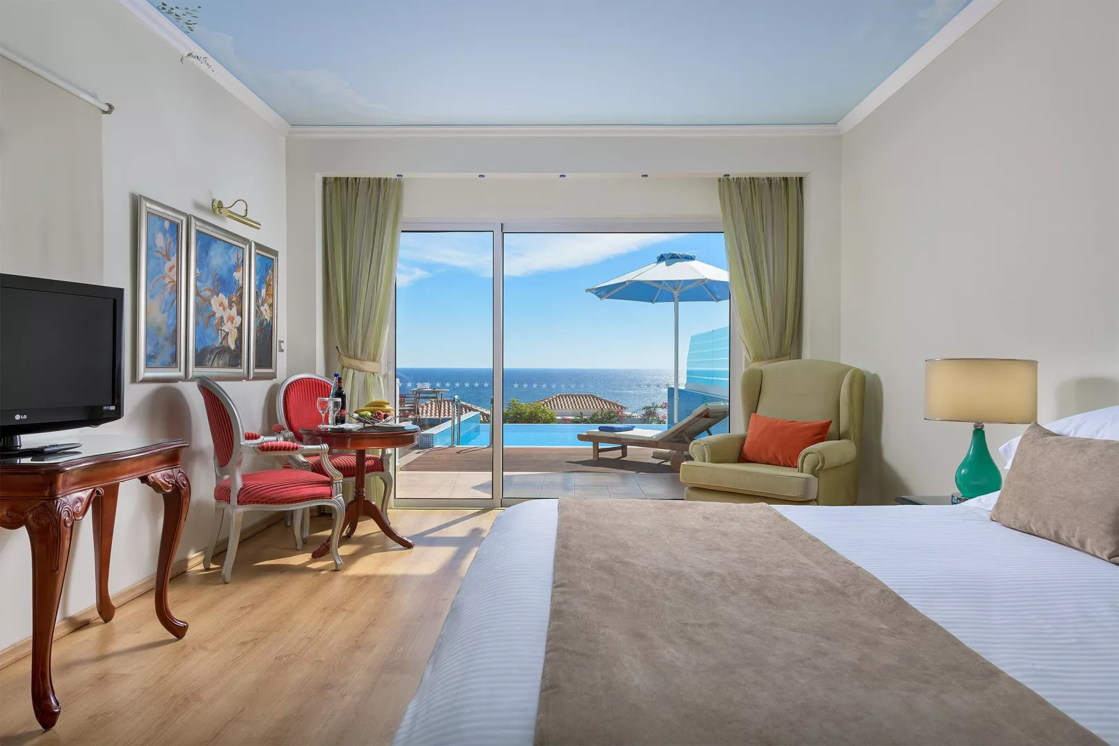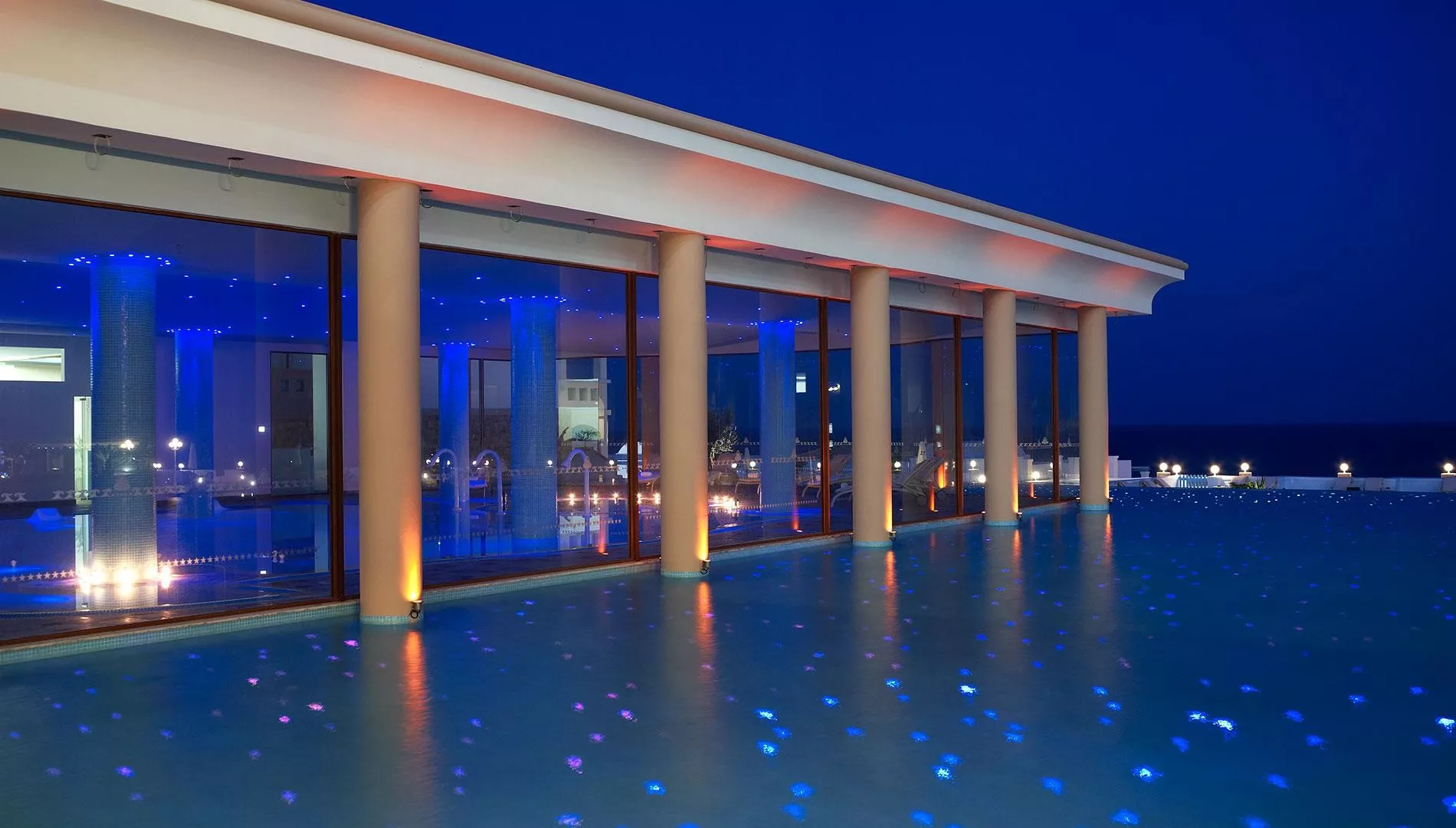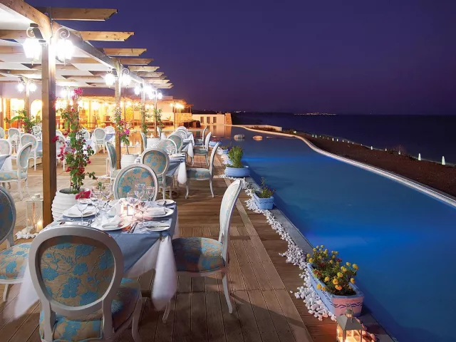 Hotel je rozdelený na hlavnú budovu, bungalovy a vily v štýle gréckej dediny. Služby sú zahrnuté: