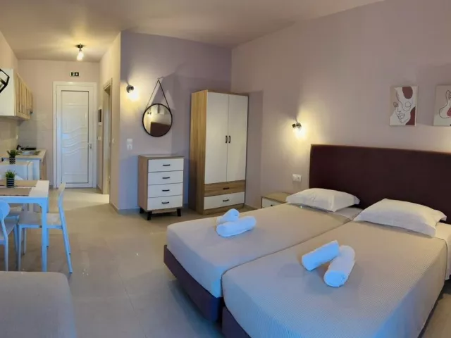Hotel poskytuje dvojlôžkové štúdiá s možnosťou prístelky, ktoré sú jednoducho a štýlovo zariadené. Každé štúdio má vlastnú kúpeľňu so sprchou a WC, fén, plne vybavený kuchynský kút, chladničku, TV a balkón alebo terasu s čiastočným výhľadom na more.