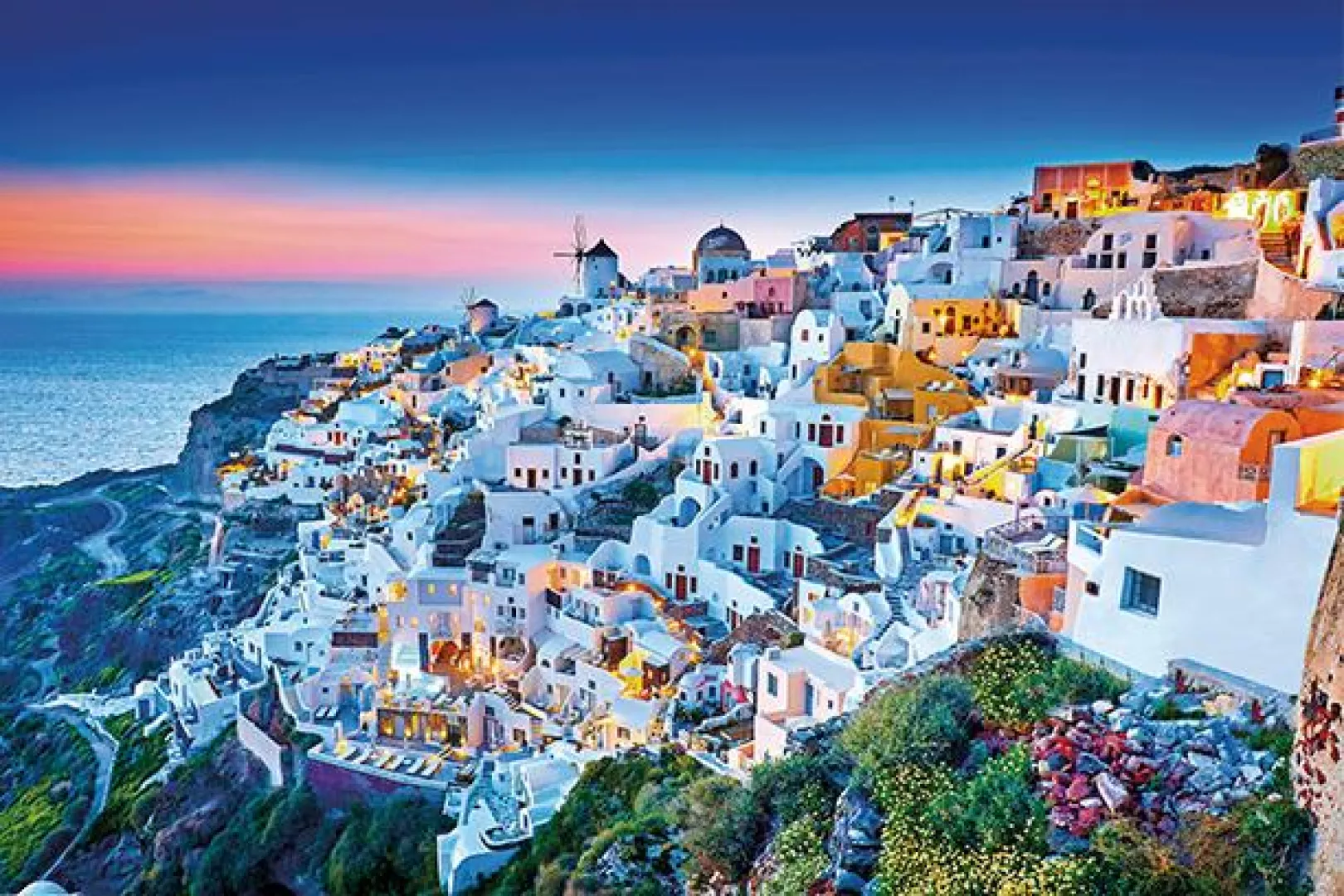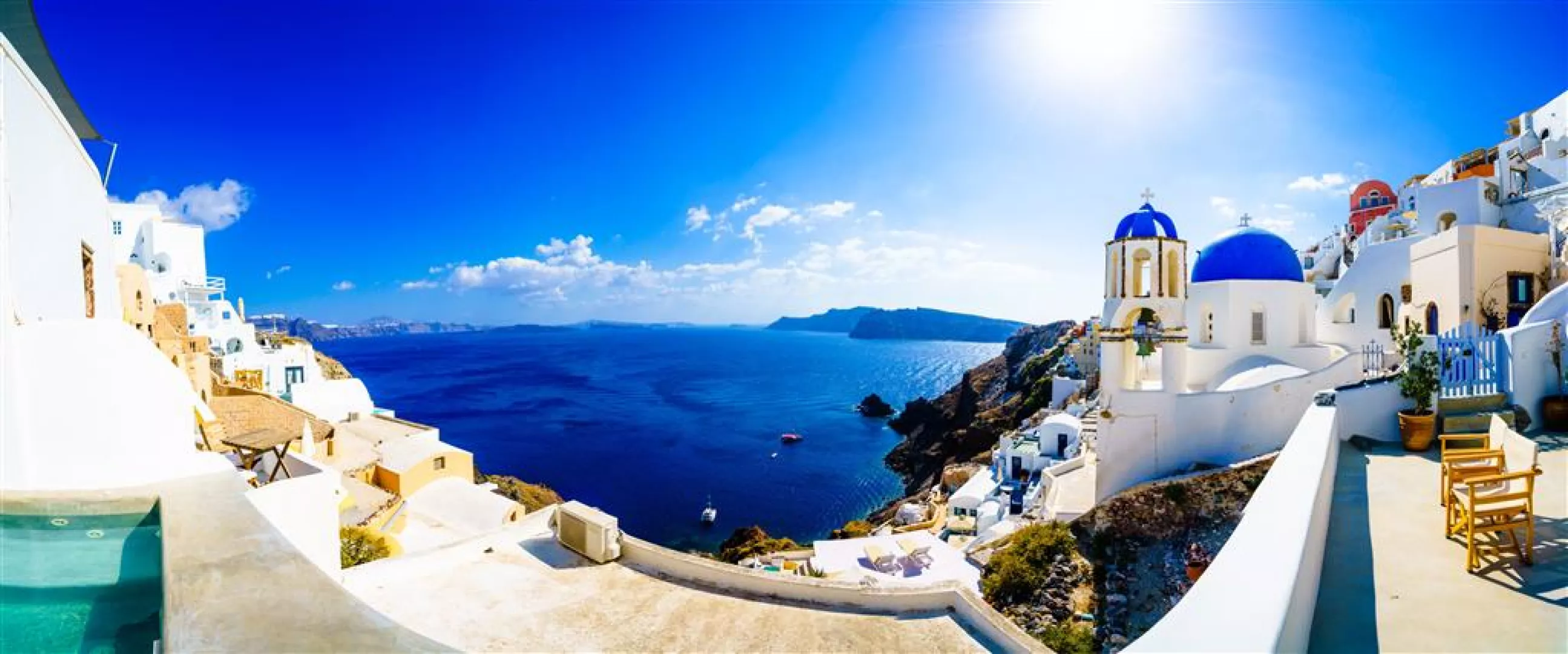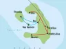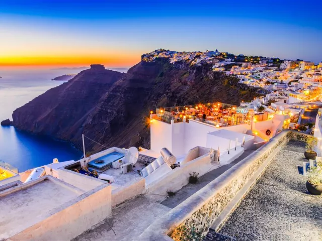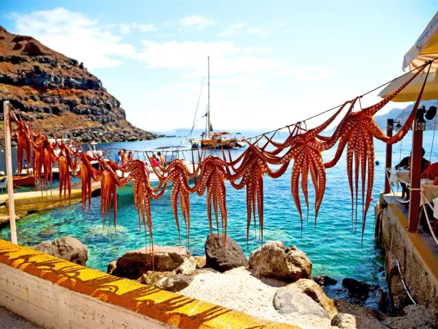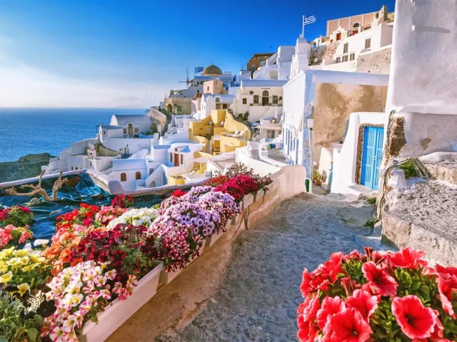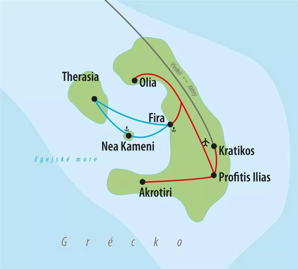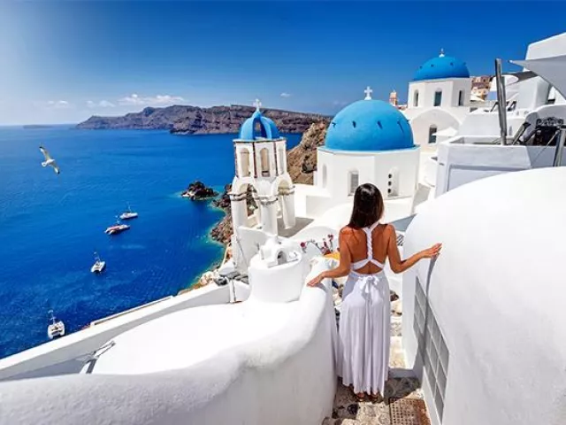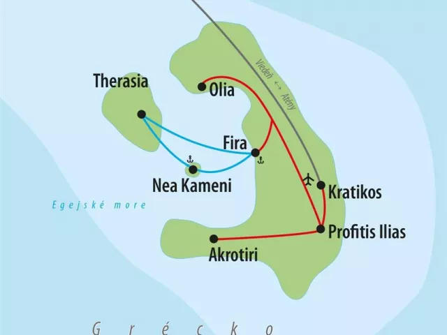 Pamiatky zahrnuté v programe obsahujú: Santorini, Oia, Fira, Akrotiri (santorínske Pompeje), plavbu kalderou a modré kupoly tradičných dediniek a kostolov.