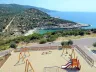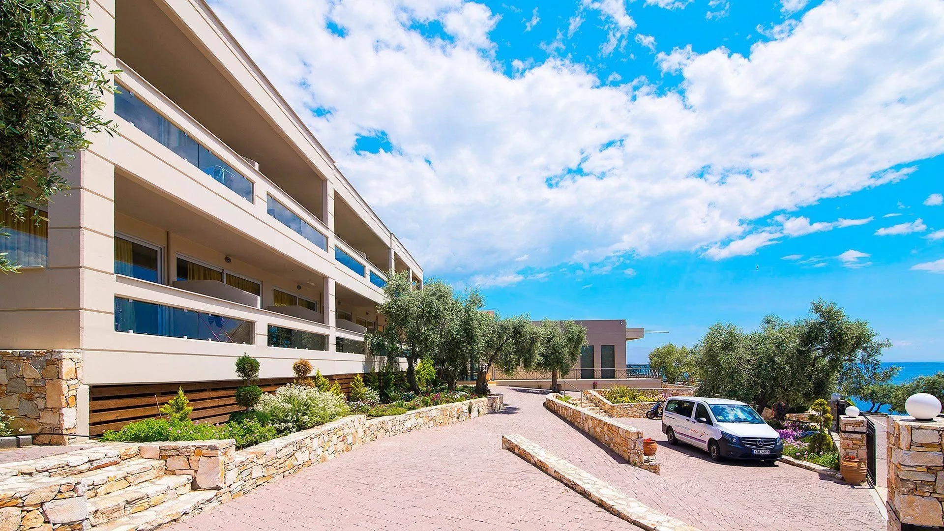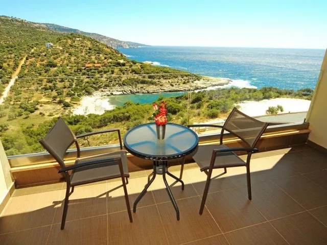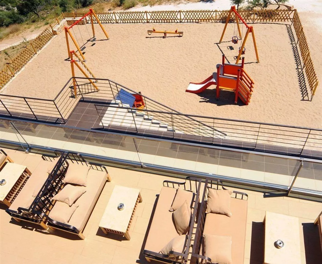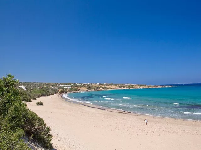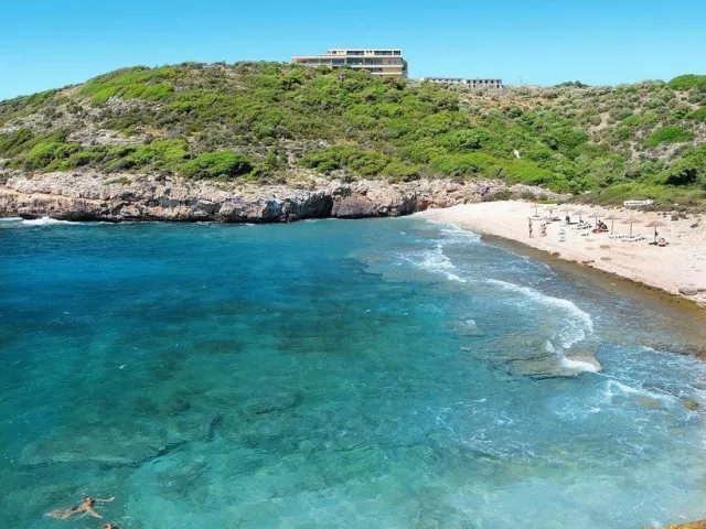 Romantická piesočnatá pláž s okruhliakmi a miestami kamenitým dnom sa nachádza priamo pod hotelom, pričom prístup k nej vedie strmšou cestou asi 200 m od hotela. Lehátka a slnečníky na pláži sú k dispozícii zdarma, avšak v limitovanom počte. Hotel zabezpečuje zdarma dopravu na vzdialenejšiu pláž Psili Amos (cca 2,5 km), kde sa lehátka a slnečníky poskytujú za poplatok.