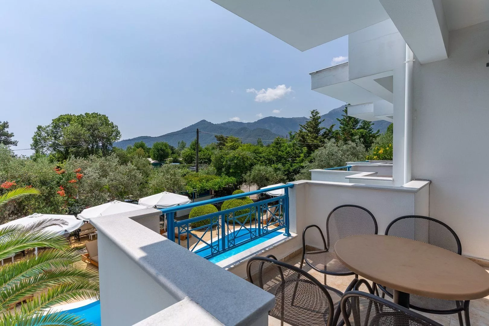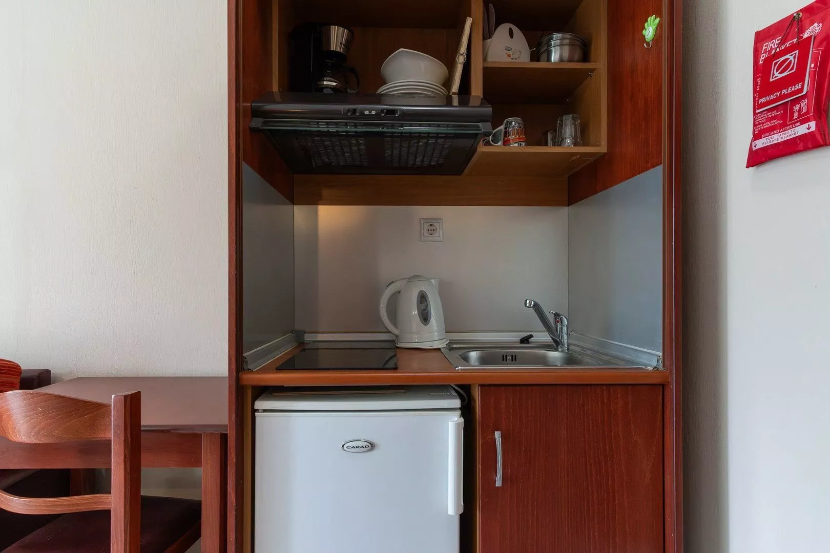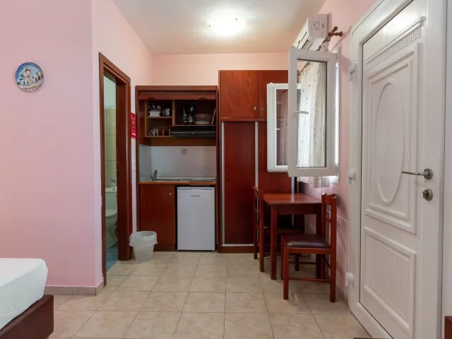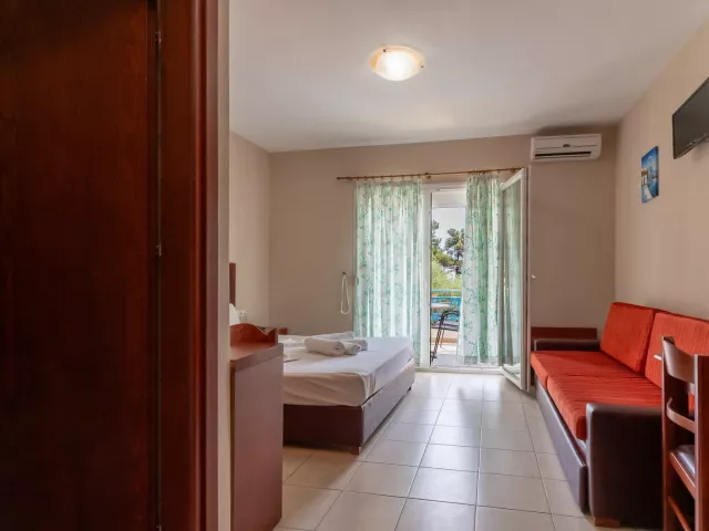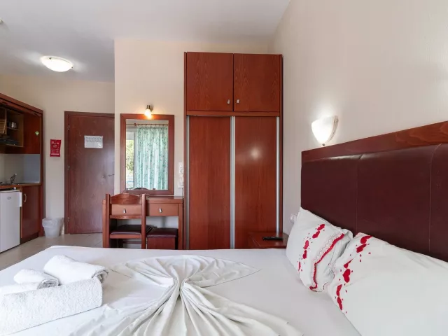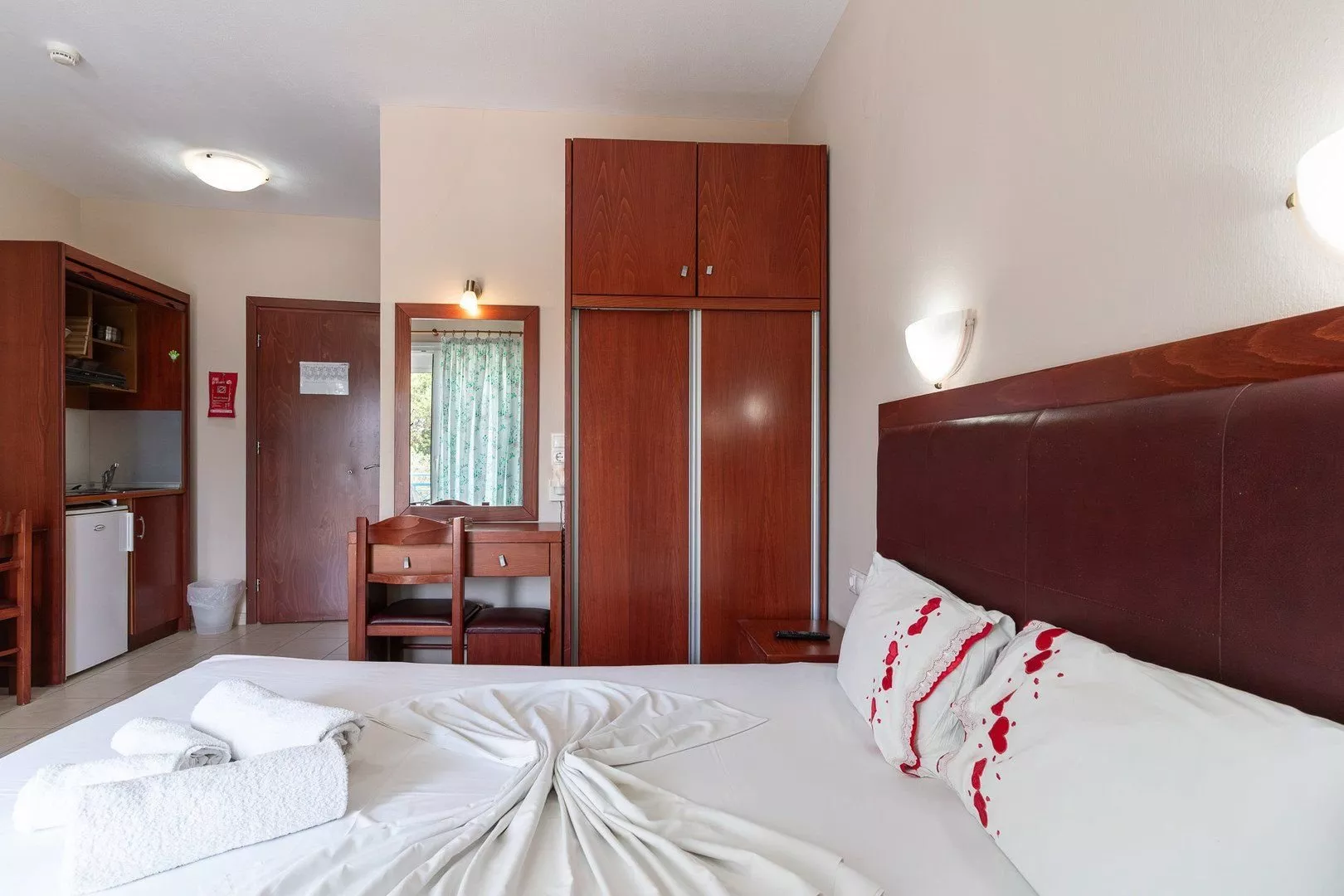 Hotel má štúdiá s výhľadom na bazén, dvojlôžkové izby a štúdiá s možnosťou prístelky. Vybavenie izieb zahŕňa WC, sprchu, fén, klimatizáciu, WiFi, chladničku, kuchynské vybavenie, TV a balkón alebo terasu.