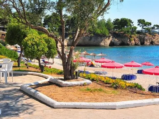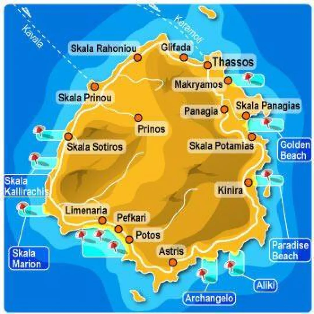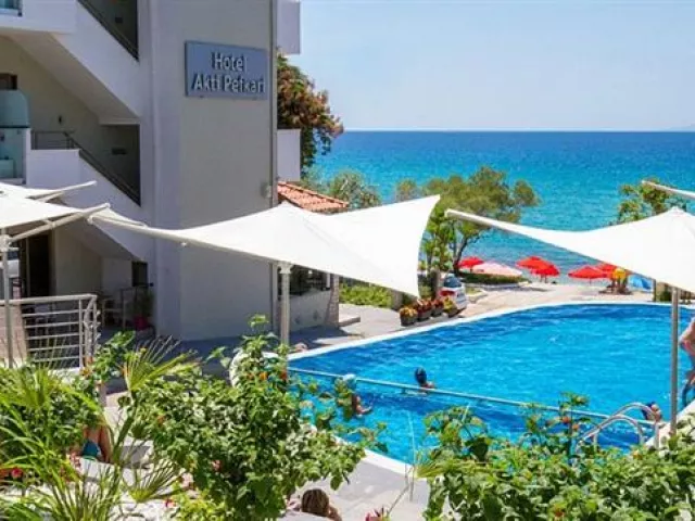 PEFKARI Stredisko Pefkari tvorí malý záliv na južnej strane ostrova a len zopár hotelových zariadení a apartmánových domov. Záliv obkolesuje píniový lesík s malými taverničkami a kaviarničkami s pokojnou atmosférou. Nachádza sa 1 km od strediska Potos a 3 km od strediska Limenaria. Pefkari patrí medzi pokojné letoviská, je tu však bohatá ponuka vodných športov ako je obľúbený paragliding, vodné skútre a bicykle. Prekrásna šíra pláž je prevažne piesková, pri vstupe do mora kamenistá.