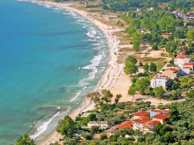 Letoviská Skala Panagia a Skala Potamia ležia na východnom pobreží ostrova Thassos, asi 10 km od hlavného mesta Limenas, v pokojnej zátoke na úpätí hory Ypsarion. Pobrežie medzi nimi lemuje krásna piesočnatá pláž Chrissi Ammoudia (Zlatá pláž, Golden Beach), ktorá bola ocenená Modrou vlajkou Európskej únie za čistotu a kvalitu. Tiahne sa okolo zátoky v dĺžke niekoľkých kilometrov. Jej povrch tvorí jemný piesok bielej až zlatistej farby, miestami sa premieňajúci na okruhliaky. Pláž Chrissi Ammoudia je ideálna pre deti i neplavcov. Milovníkov šnorchlovania poteší krása podmorského sveta a rozmanitosť morských živočíchov na okolitých útesoch. Nechýbajú ani možnosti vodného lyžovania a vodné bicykle. Zelené údolie plné hájov láka k romantických vychádzkam. Čarovnými výhľadmi na pobrežie Egejského mora sa môžete kochať pri výstupe na najvyšší vrch ostrova - horu Ypsarion. Pokojné letovisko Skala Panagia sa nachádza na severe zátoky. K nemu patrí horská dedinka Panágia, známa rodinnými tavernami, ktoré lákajú bohatou ponukou tradičných gréckych jedál z kozľaciny, jahňaciny a lahodných vín miestnej produkcie. Do južnej rušnejšej Skala Potamie sa dostanete príjemnou pešou prechádzkou alebo výletným vláčikom. Tu si môžete užiť typickú dovolenkovú atmosféru na živej pobrežnej promenáde.