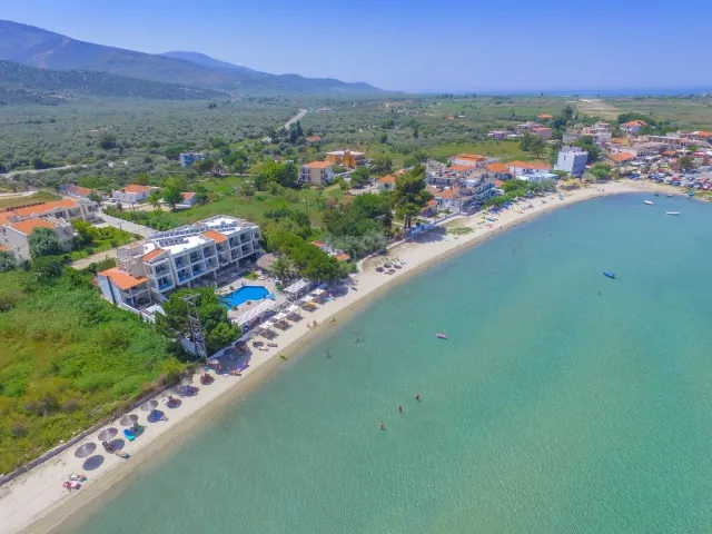 Moderný, stredne veľký hotel je situovaný v kľudnej časti strediska Skala Prinos, kde sa nachádzajú niektoré výborné taverny a príjemné miesta na posedenie. Od samotného centra Skala Prinos a menšieho prístavu je hotel vzdialený približne 500 m. Najbližší obchod a autobusová zastávka sú vo vzdialenosti približne 150 - 200 m. Letisko v Kavale sa nachádza cca 40 km od hotela, pričom hotel je vzdialený len 60 m od hlavnej cesty.