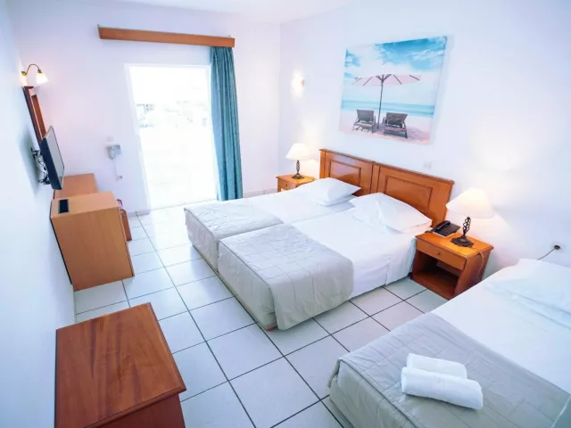 Piesočnato-kamienková pláž sa nachádza približne 200 metrov od hotela, prístupná cez miestnu komunikáciu. Lehátka a slnečníky sú k dispozícii za poplatok, osušky sú poskytované zdarma.