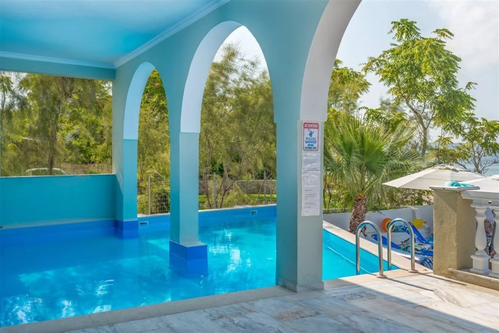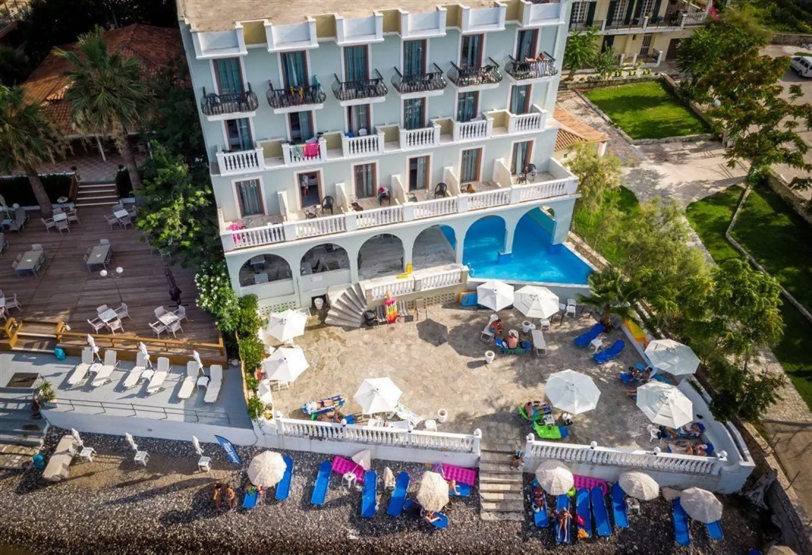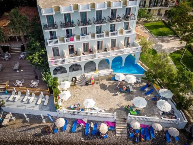 Malá kamienková pláž s miestami s kameňmi je priamo pod hotelom, prístupná z hotelovej terasy po niekoľkých schodoch. Lehátka sú k dispozícii zdarma.