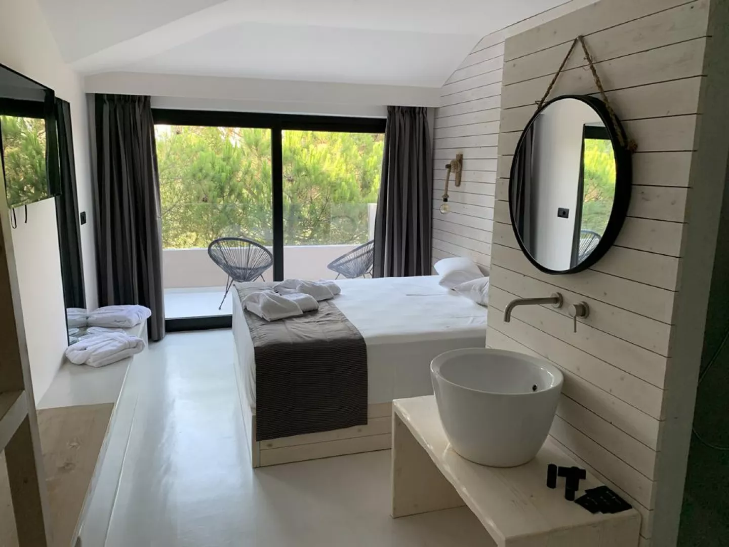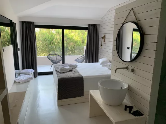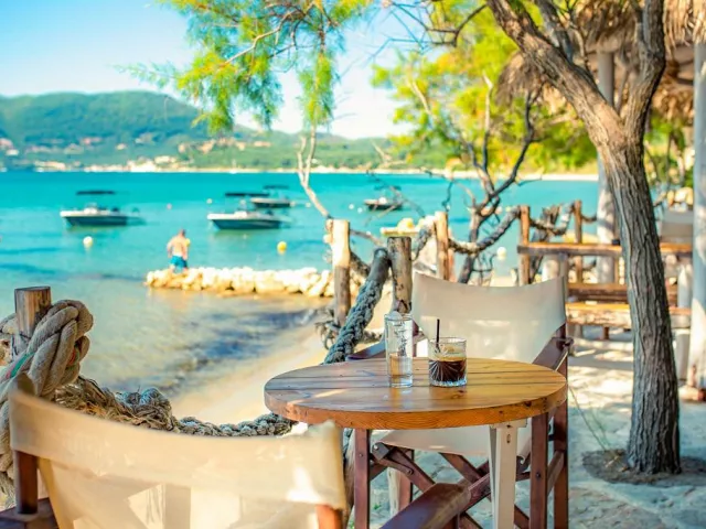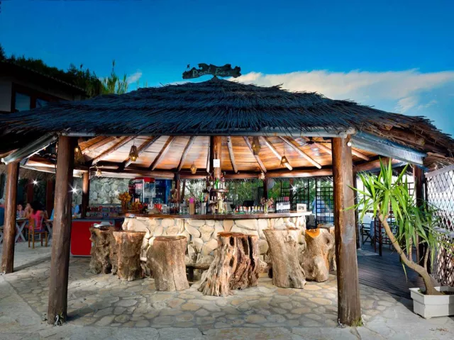 Pláž je piesočnatá a úzka, so slnečníkmi a lehátkami za poplatok. K dispozícii je aj plážový bar.