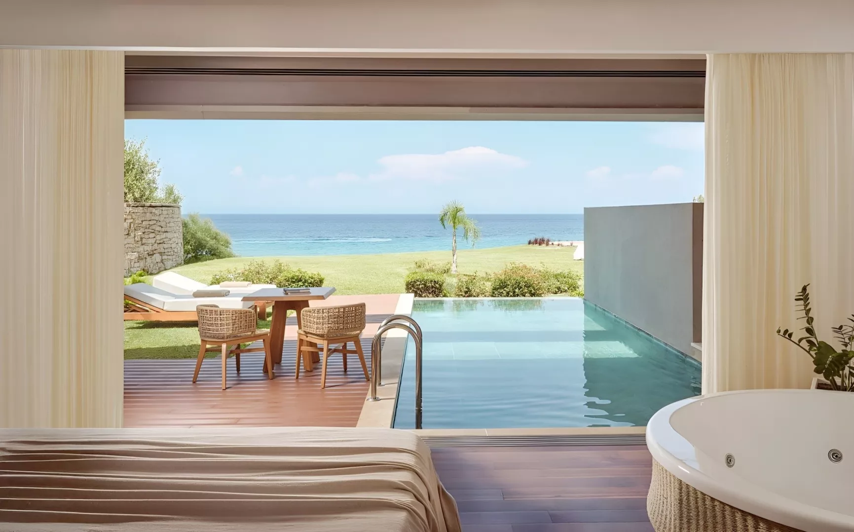Suita, Výhľad more: kúpeľňa/WC (sušič vlasov), klimatizácia, minibar, balkón alebo terasa, žehlička a žehliaca doska na vyžiadanie, výhľad mora. 45m2 Ostatné typy izieb (pokiaľ nie je uvedené inak, majú izby vyššie uvedené vybavenie) Suita, Outdoor Jacuzzi, Výhľad more: jacuziu, výhľad mora. Signature Suita, Výhľad more, Súkromný bazén: súkromný bazén, výhľad na more Honeymoon Suita, Výhľad more, Súkromný bazén: priestrannejší 58m2, výhľad na more, súkromný bazén Suita, Deluxe, Výhľad more, Súkromný bazén: priestrannejší 85m2, výhľad na more, súkromný bazén Grand Royal Suita, Výhľad more, Súkromný bazén: priestranná miestnosť s terasou a bazénom 160m2, výhľad na more, súkromný bazén