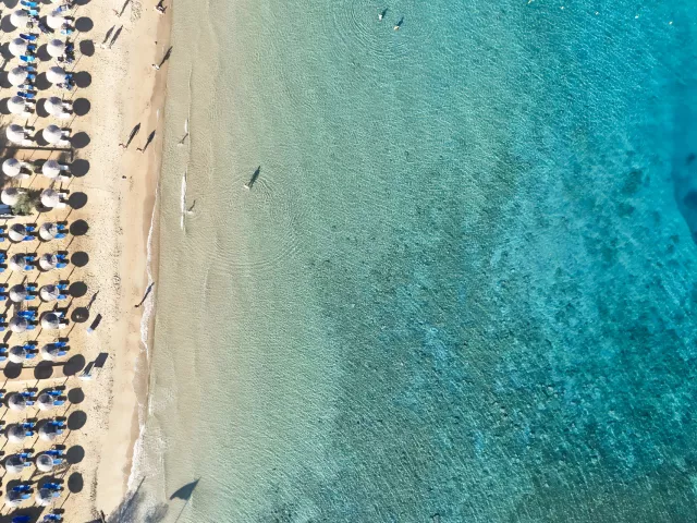 Piesočnato-kamienková pláž s pozvoľným vstupom do mora je vzdialená približne 200 m od hotela, lehátka a slnečníky za poplatok.