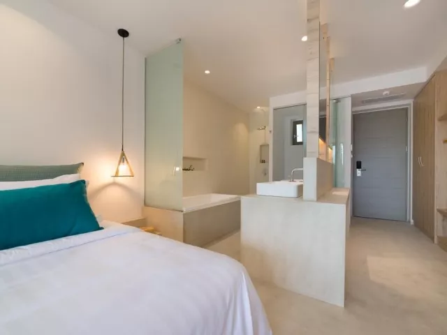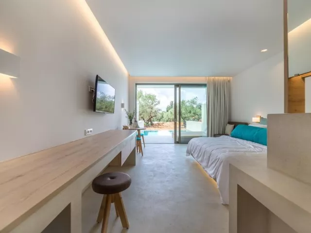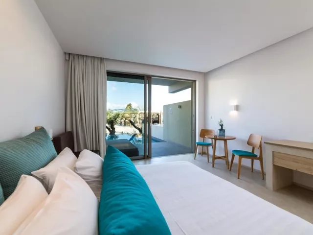 Kútik pre juniorov individuálne ovládaná klimatizácia Satelitná televízia telefón kúpeľňa/WC (sušič vlasov) trezor na izbe (zdarma) mini chladnička, minibar (za poplatok) Wi-Fi (zdarma) balkón alebo terasa spálňa s obývacou časťou Ďalšie typy izieb (ak nie je uvedené inak, všetky izby majú vyššie uvedené vybavenie) Luxia Junior, súkromný bazén: extra súkromný bazén Junior Suite, výhľad na more, súkromný bazén: súkromný bazén a výhľad na more Junior Suite, výhľad na more: výhľad na more Suita, Superior: oddelená spálňa a obývacia izba Suita, Superior, Súkromný bazén: oddelená spálňa a obývacia izba, súkromný bazén