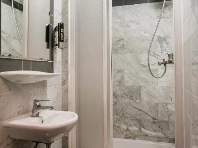 DOUBLE WITH DOUBLE BED - small private bathroom cca 10 m² vlastní koupelna se sprchou a fénem SINGLE STANDARD - (PRIVATE BATHROOM) cca 10 m² vlastní koupelna se sprchou a fénem