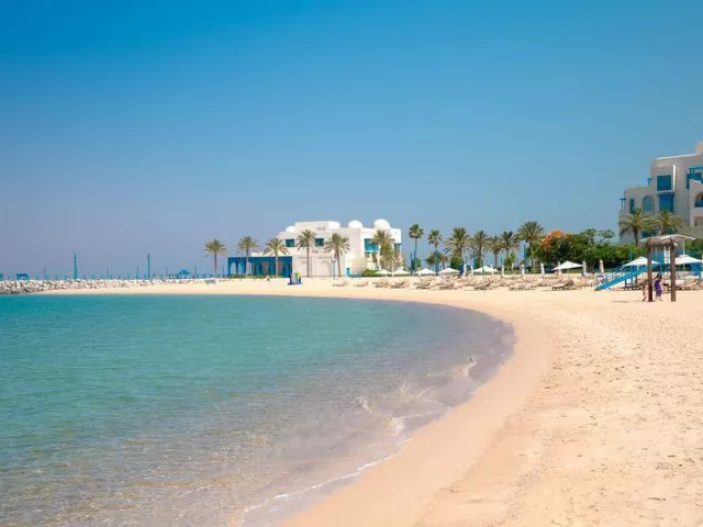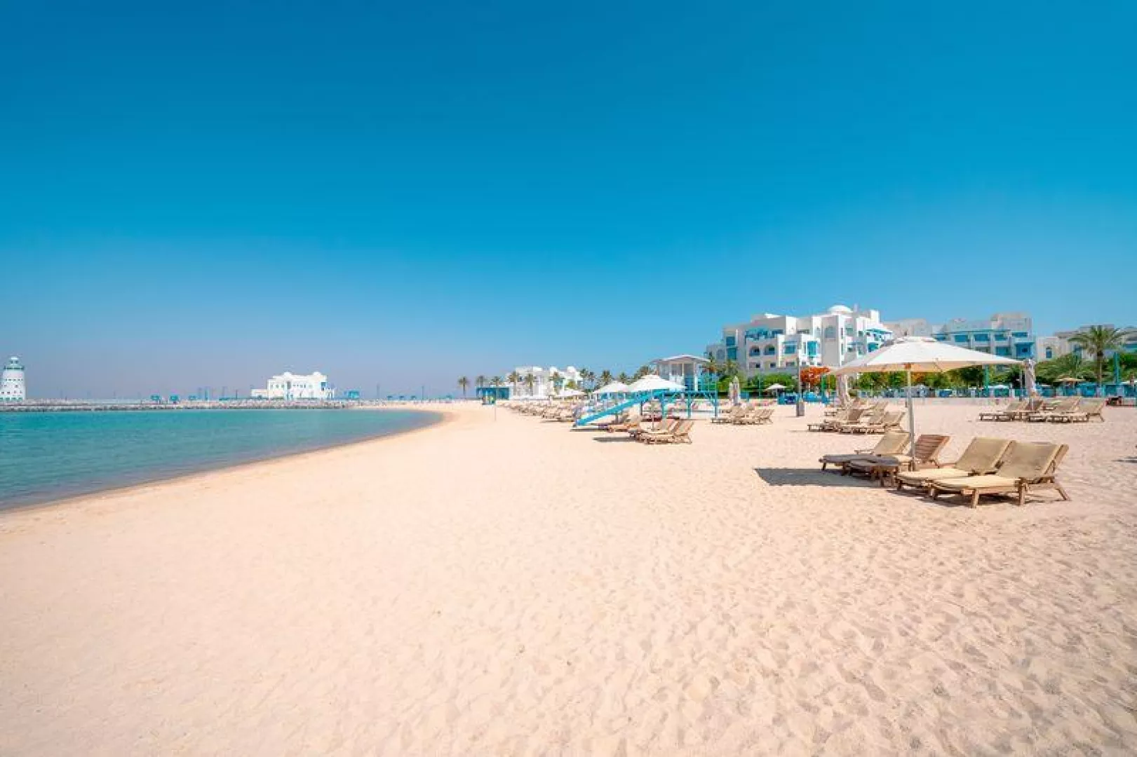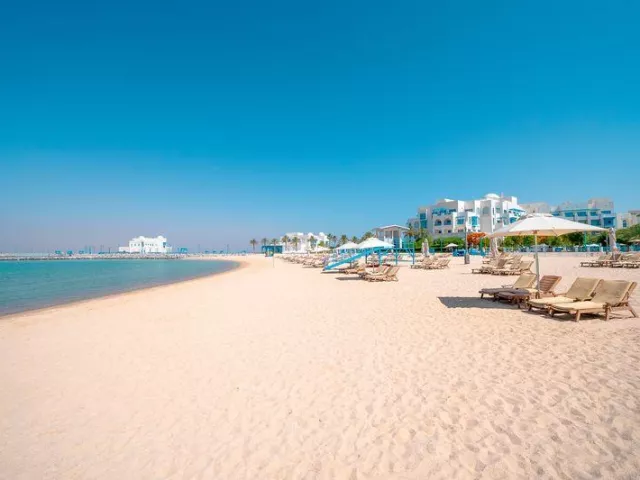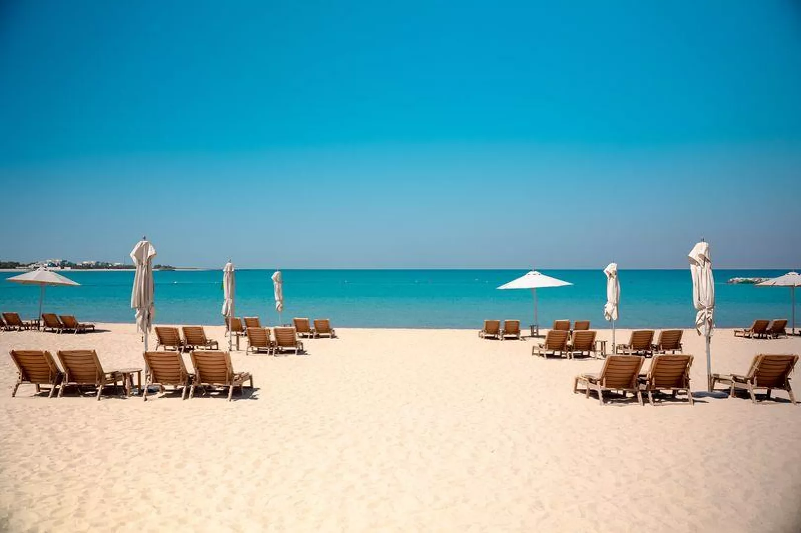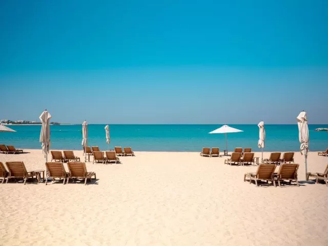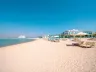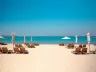 Nádherná pláž s jemným bielym pieskom a pozvoľným vstupom do mora, s bezplatným plážovým servisom.