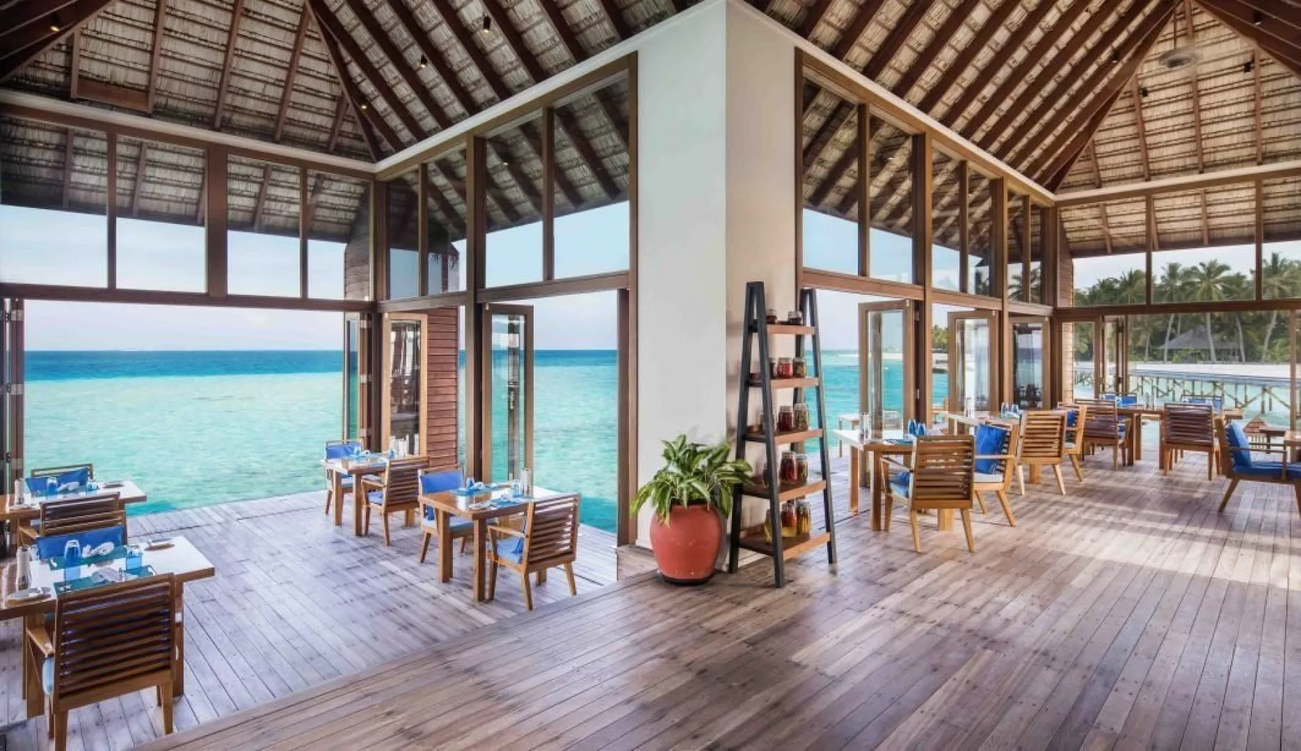 Areál hotelu ponúka 11 exkluzívnych reštaurácií a 3 bary, pričom reštaurácia Ithaa, nachádzajúca sa 6 metrov pod hladinou oceánu, je svetovo uznávaná. Medzi ďalšie reštaurácie patrí Atoll Market, Koko Grill Restaurant a Mandhoo Spa Restaurant, kde si prídete na svoje aj s modernými európskymi pokrmami. Nechýbajú ani možnosti pre milovníkov vína či čínskej kuchyne, vrátane čajovne.