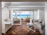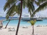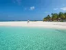 Pláž s jemným bielym pieskom a bezplatnými ležadlami a slnečníkmi.