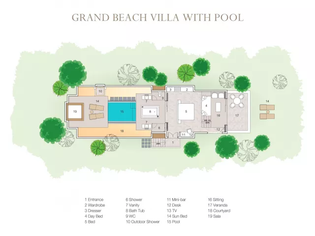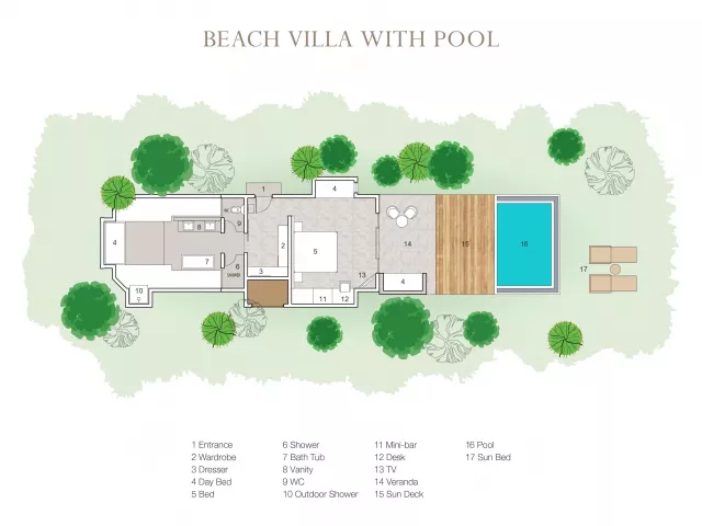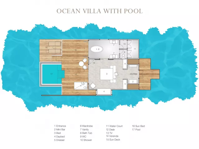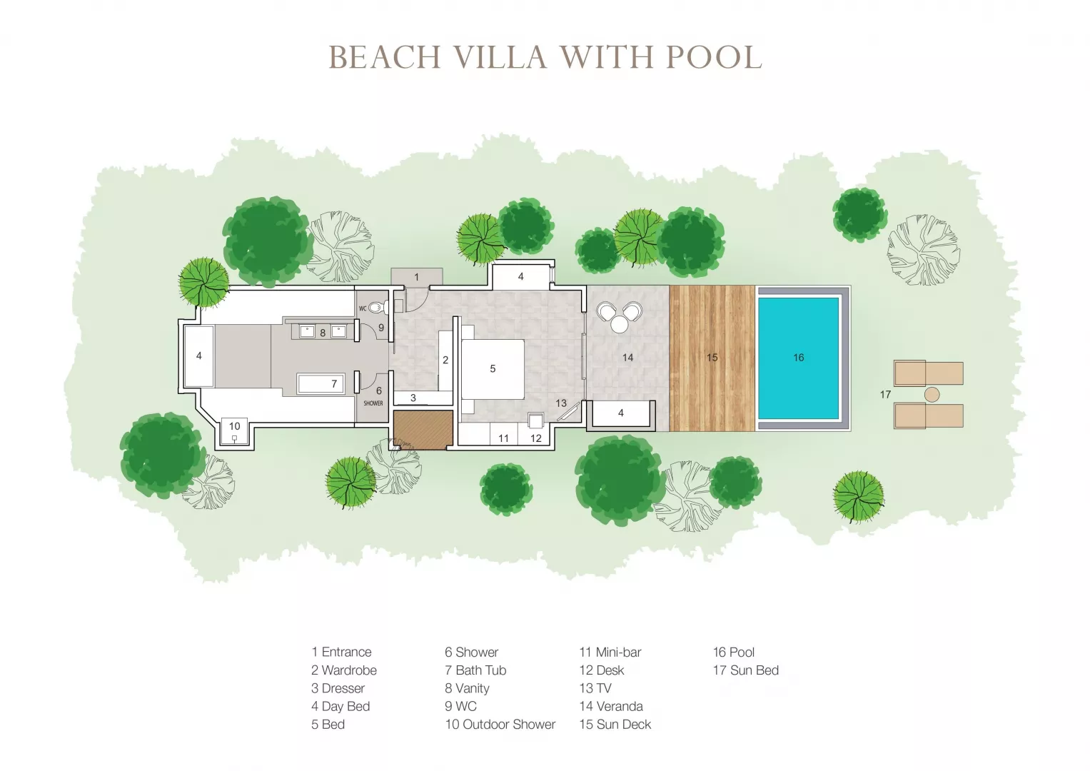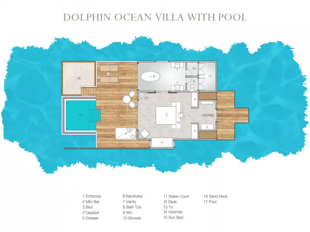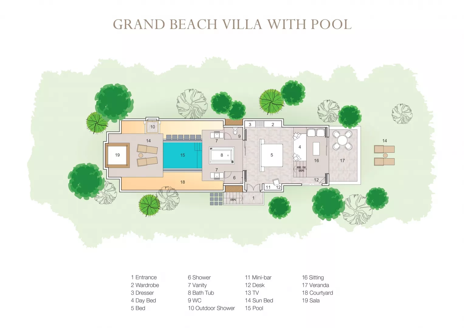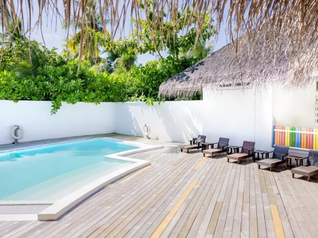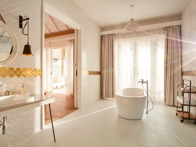 Izby zahŕňajú 125 svetlých víl s možnosťou výberu medzi plážovými a nadvodnými variantmi, pričom každá vila má vlastný bazén. Grand Beach Villa, Beach Villa with Pool a Ocean Villa with Pool sú iba niektoré z možností, ktoré offtujú elegantný dizajn, dostatok súkromia a priestrannosti, ideálne pre romantické pobyty aj rodinné výlety.