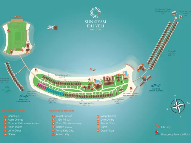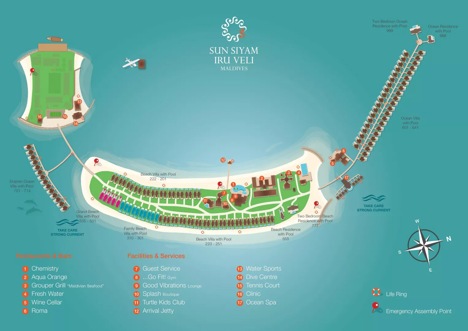 Rezort má tri reštaurácie a tri bary, ktoré ponúkajú bohaté menu zamerané na uspokojenie chutí aj tých najnáročnejších návštevníkov. Sun Aqua Spa, umiestnené nad lagúnou, ponúka relaxačné procedúry a nádherný výhľad na oceán, pričom je skvelým miestom pre celkové uvoľnenie tela a duše.
