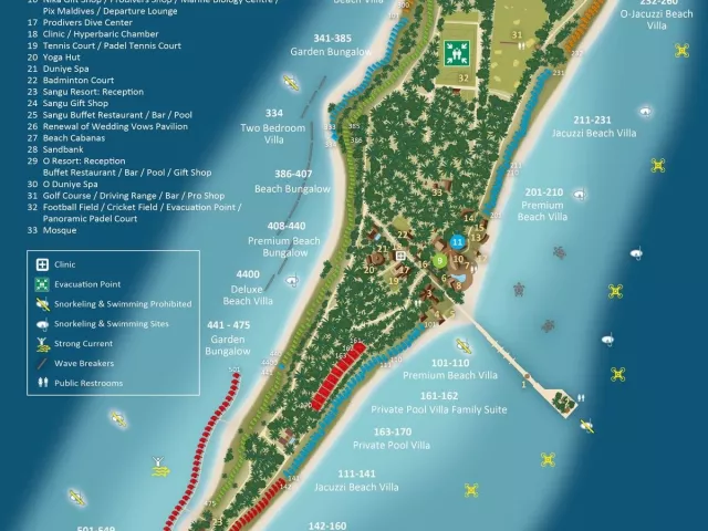 Hotel ponúka komplexné služby a širokú škálu vybavenia rozdeleného do viacerých častí. Sangu Resort je určený pre návštevníkov starších ako 18 rokov, zatiaľ čo O Resort je pre hostí od 12 rokov. Rezort disponuje príjemnou recepciou, štyrmi hlavnými reštauráciami, tromi á la carte reštauráciami a deviatimi barmi, ako aj viacerými bazénmi, vrátane infinity bazéna pre dospelých.
