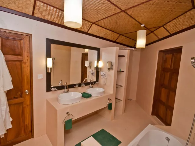 Plážový bungalow s možnosťou prídavnej postele je klimatizovaný, má vlastné sociálne zariadenie (WC, sprcha, fén) a je vybavený TV/SAT, trezorom, minibarom (za príplatok), telefónom, setom na prípravu kávy/čaju, balkónom alebo terasou. Vodný bungalov ponúka rovnaké vybavenie ako plážový bungalov, avšak s priamym vstupom do oceánu a terasou s vlastnými ležadlami. Semi vodný bungalov sa nachádza na vode v blízkosti pláže s priamym vstupom do oceánu.