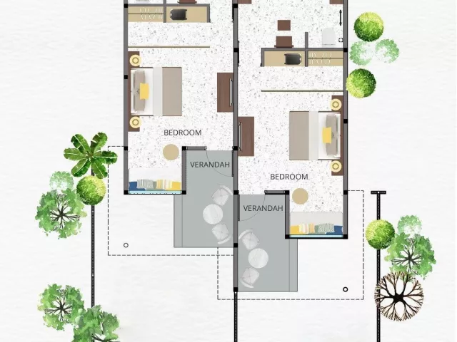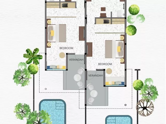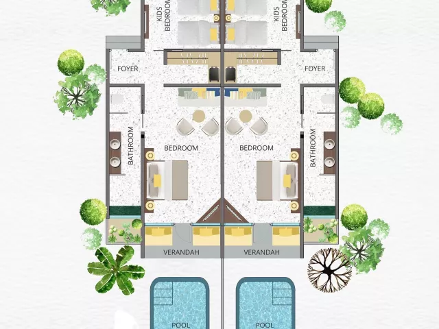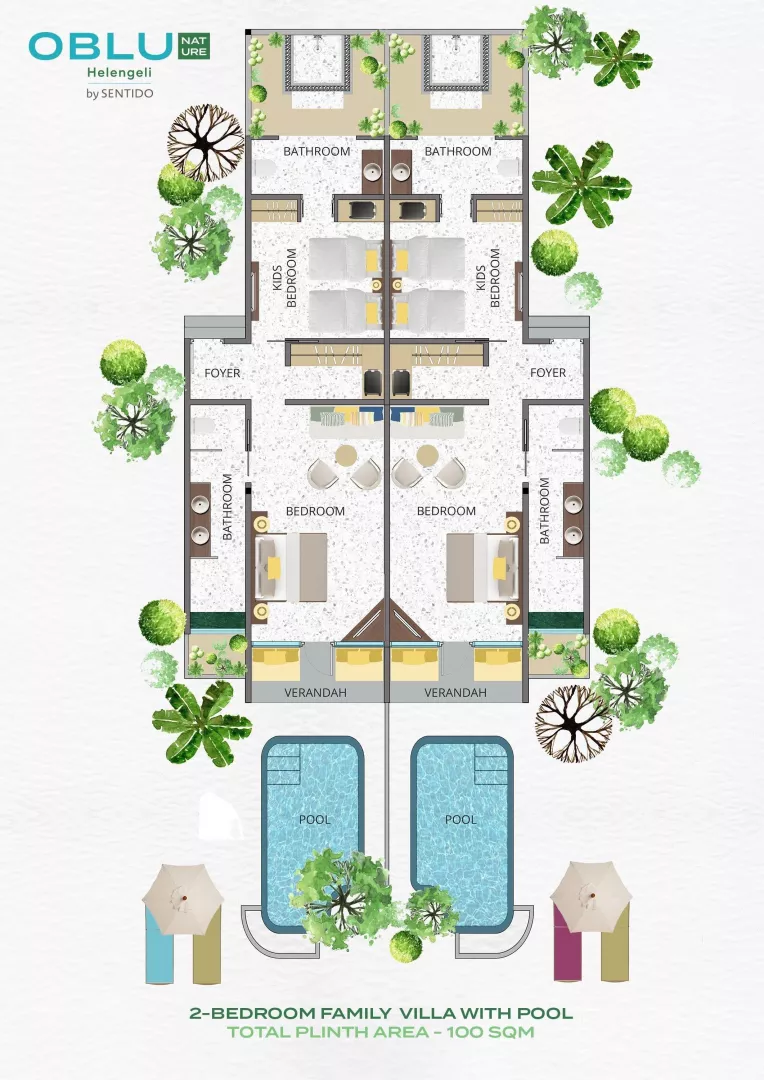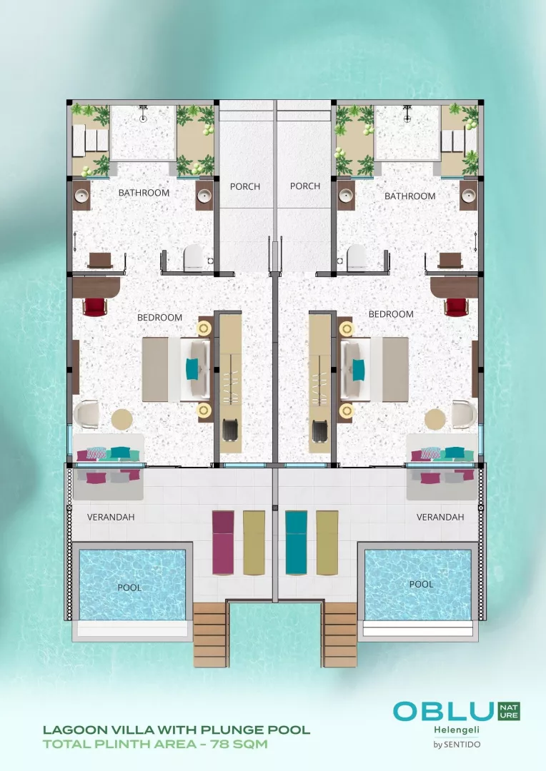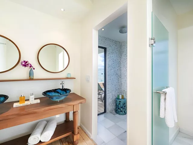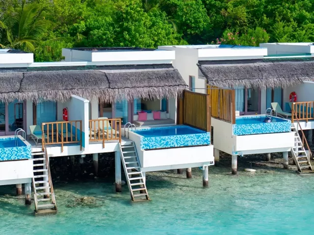 Luxusná plážová vila má rozlohu 57 m² a je dvojpodlažná s polootvorenou kúpeľňou, sprchou a WC. Každá izba je vybavená županom, sušičom vlasov, klimatizáciou, ventilátorom, minibarom (zdarma), trezorom, TV, Wi-Fi, príslušenstvom na prípravu kávy/čaju a terasou s výhľadom na oceán. K dispozícii sú aj rôzne typy izieb: