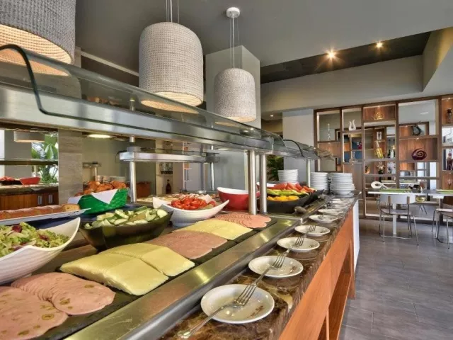 Bez stravy, ale za príplatok je možnosť raňajok alebo polpenzie. Raňajky a večere sú podávané formou bufetu. Mimo hlavnej sezóny môžu byť večere aj formou a la carte.