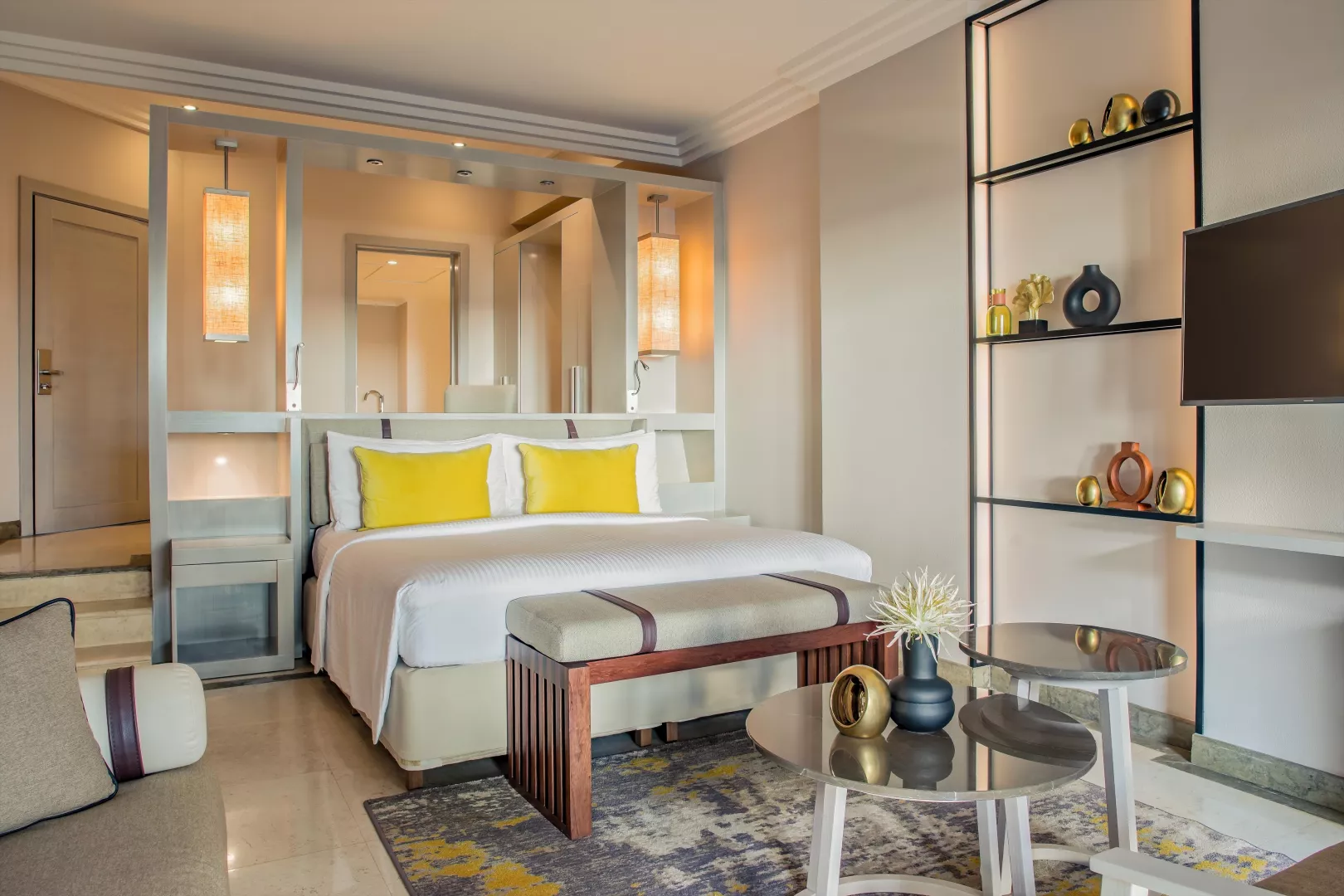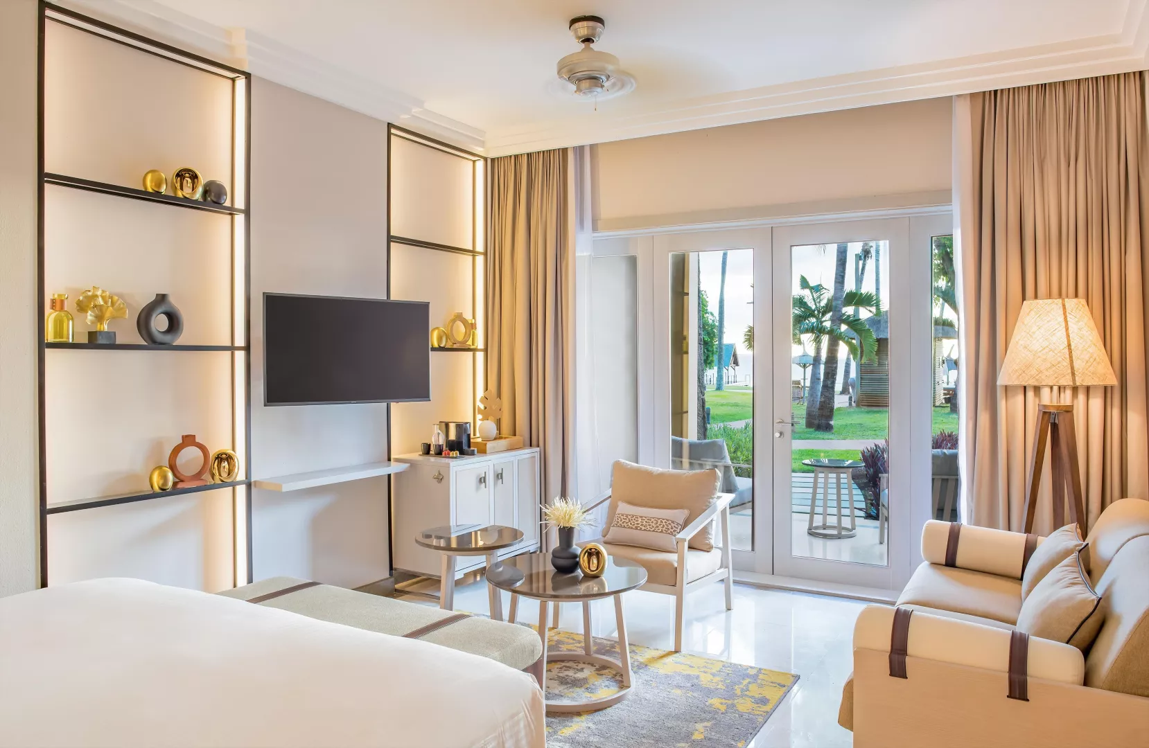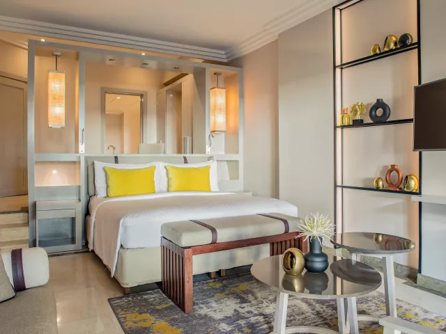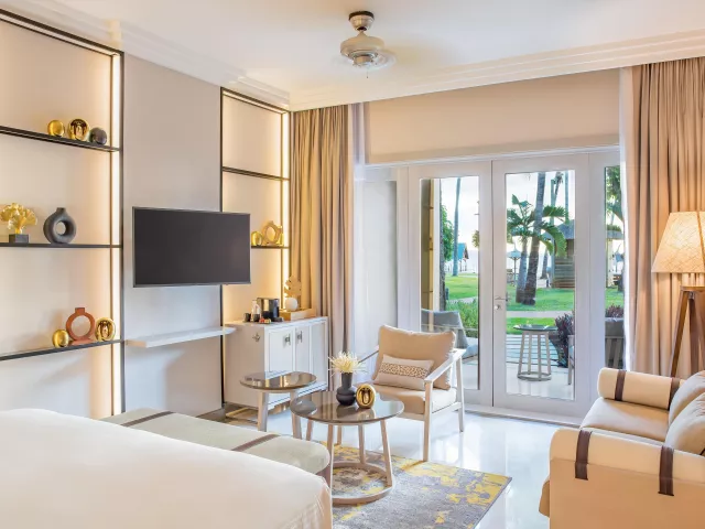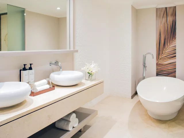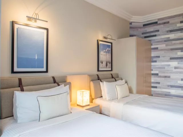 Dvojlôžková izba, Deluxe, morská strana: telefón, TV/sat., trezor, kúpeľňa/WC (sušič vlasov), wifi, minibar, set na prípravu kávy a čaju, balkón alebo terasa s výhľadom na more (čiastočne môže blokovať výhľad zeleň). Ostatné typy izieb (pokiaľ nie je uvedené inak, majú izby vyššie uvedené vybavenie) Dvojposteľová izba, Prestige, výhľad na more: priamy výhľad na more, Nespresso kávovar. Rodinná izba : priestrannejšia