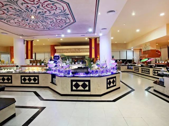 Vstupná hala s recepciou a 774 izbami v troch trojpodlažných budovách obklopených tropickou záhradou. Hostia môžu využiť tri bazény, päť reštaurácií a sedem barov. K dispozícii je aj detský vodný park, diskotéka, kaderníctvo a lekáreň. Wi-Fi je zdarma v lobby.