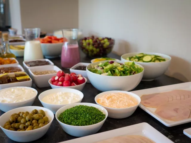 Raňajky sú podávané formou bufetu, čo umožňuje hostiť si vybrať z rôznych jedál podľa chuti.
