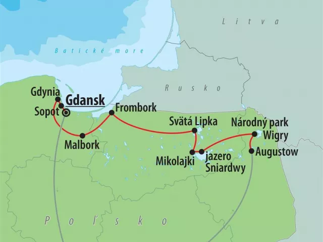 4. deň - raňajky, prehliadka mesta Gdynia, ktoré nadobudlo na význame po vybudovaní prístavu v rokoch 1923 - 1934. Prehliadka najcharakteristickejšej časti mesta - prístavu s kotviacim múzeom – torpédoborec Blyskawica a storočný trojsťažník Dar Pomorza, Múzeum poľského námorníctva, Gdyňské akvárium. Možnosť návštevy niektorého z múzeí. Zastávka na plážach Baltského mora s krásnym bielym pieskom v mestečku Sopot. Popoludní prehliadka jedného z najkrajších a najstarších miest Poľska, mesta Gdansk, kedysi nazývaného „Aurea Porta“ - Zlatá brána Poľska. Prehliadka najkrajšej časti mesta - Ulica Długa a Długy Targ, pešia zóna lemovaná historickými budovami, zakončená na oboch koncoch architektonicky zložitými mestskými bránami. Táto časť sa nazýva aj Kráľovská cesta. Nemožno minúť ani najkrajšiu ulicu starého mesta, Mariacka. Symbolom mesta je Neptúnova fontána pred budovou súdu, ale aj 700-ročný Žuraw. Fakultatívne plavba loďou k lodeniciam Westerplate. Ubytovanie a nocľah.