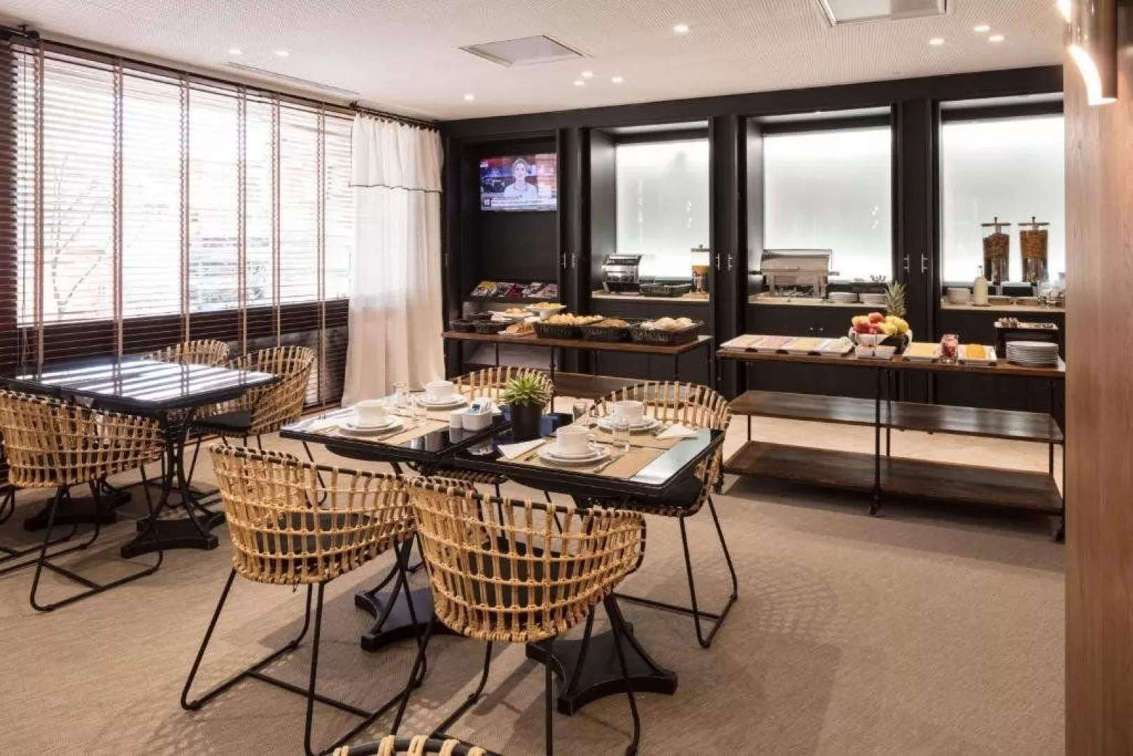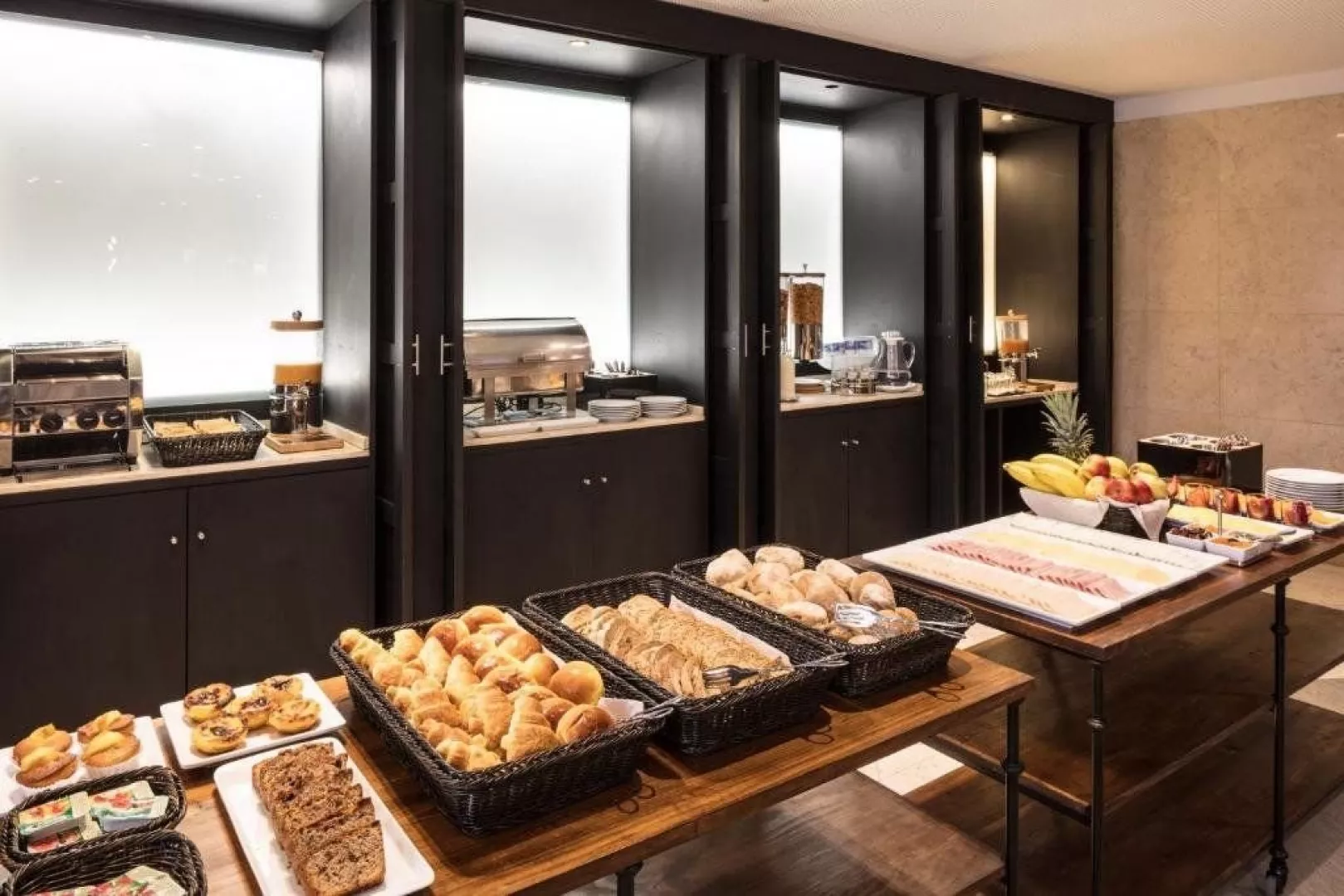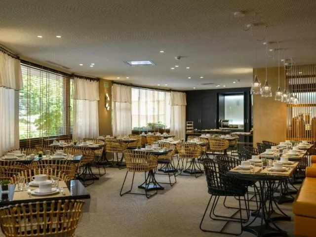 Raňajky sú podávané formou bufetu v hotelovej reštaurácii, pričom počas jedla je k dispozícii výber nápojov.