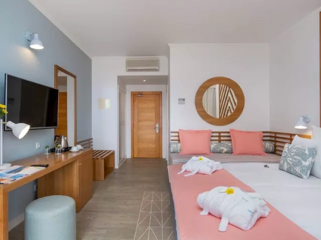 Standardní pokoje s možností jedné přistýlky a výhledem na moře mají vlastní sociální zařízení (koupelna, WC, fén) varnou konvicí (zdarma), minibar (za poplatek), balkón nebo terasu, WiFi (zdarma), trezor (zdarma) a SAT/TV. Pokoje Superior, Deluxe nebo Family jsou prostornější a stejně vybavené jako standardní pokoje.