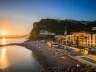 Kamenitá pláž sa nachádza priamo pred hotelom, oddelená miestnou komunikáciou.