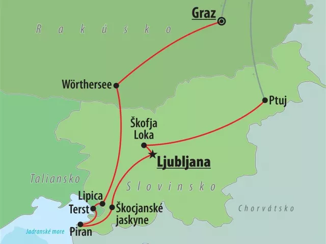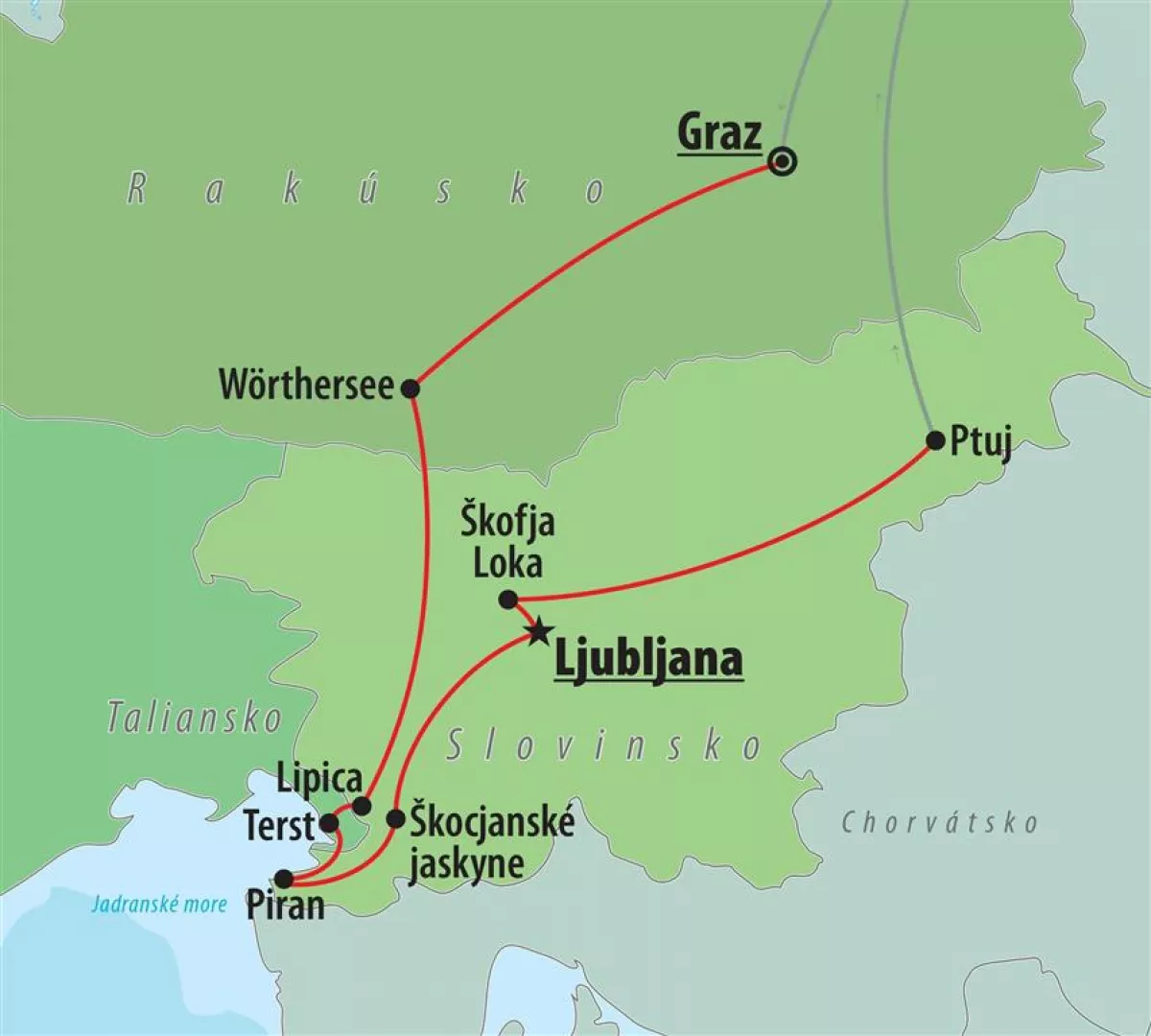Na zájazde objavíte množstvo pamiatok, medzi ktorými sú Graz, Wörthersee, Lipica, Miramare, Terst, Piran, Škocjanské jaskyne, Ľubľana, Škofja Loka a Ptuj.