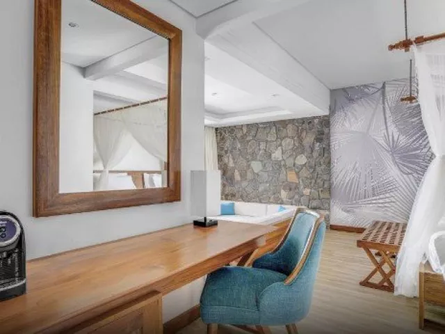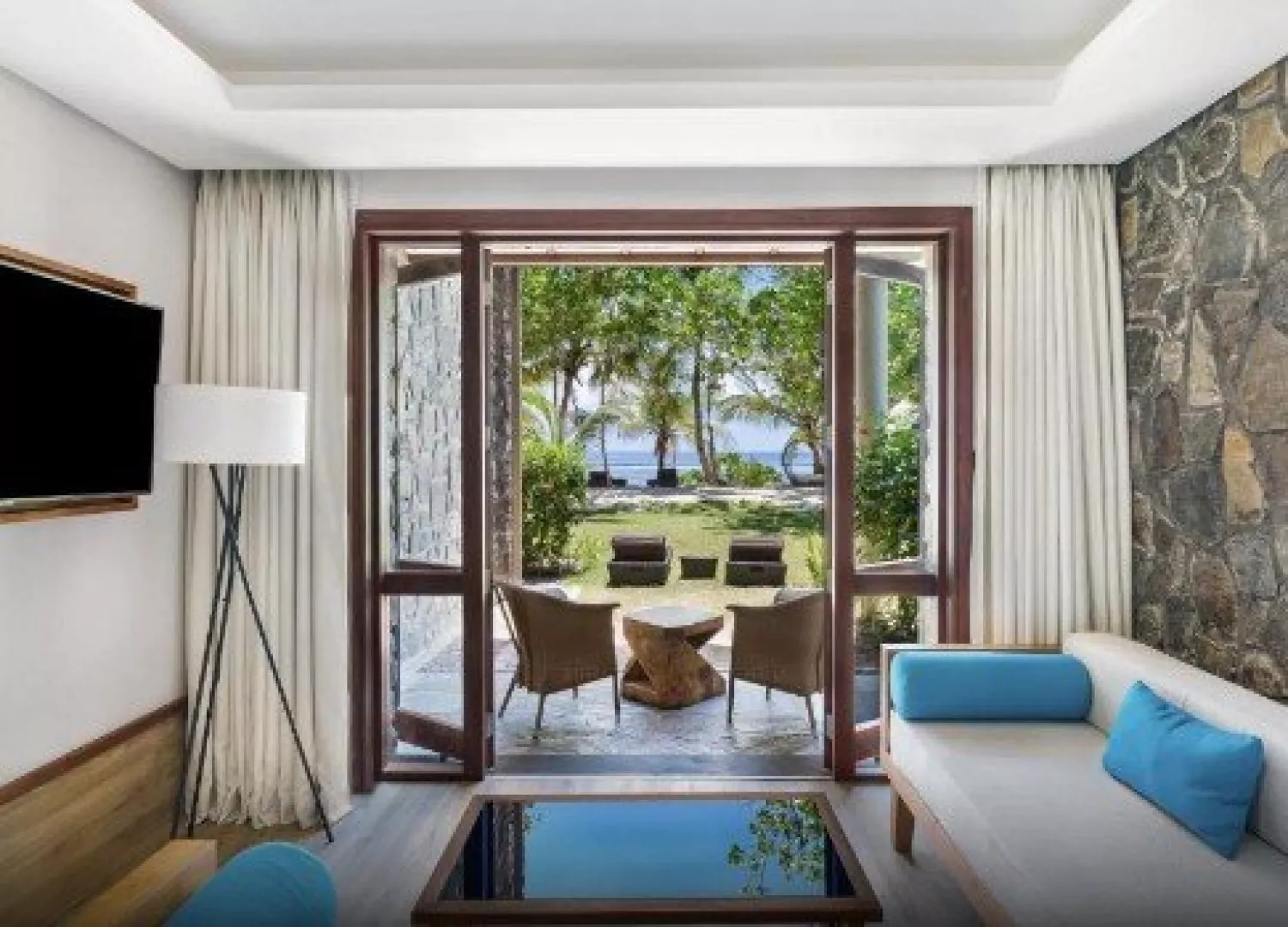 Príjemná dlhá piesočná pláž sa nachádza priamo pri hoteli v zátoke Baie Lazare, poskytujúc ideálne podmienky na slnenie a relaxáciu.