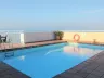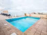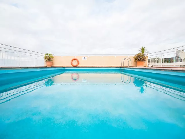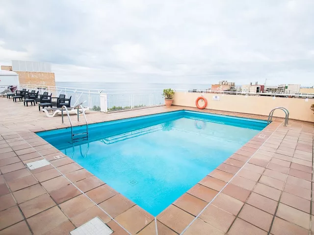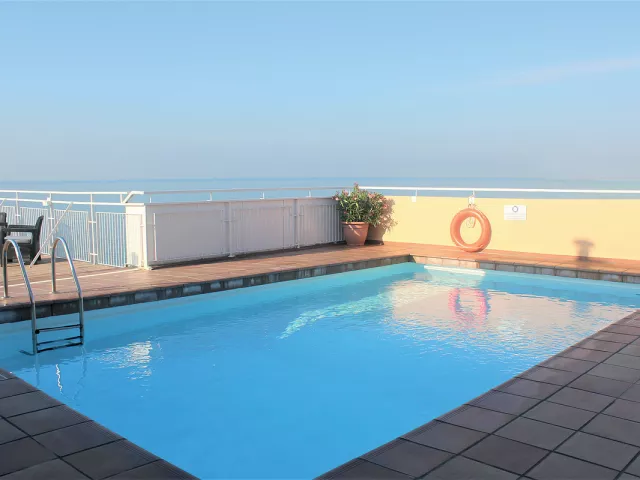 slnečná terasa na streche s ležadlami, malým detským bazénikom s bazénom pre dospelých