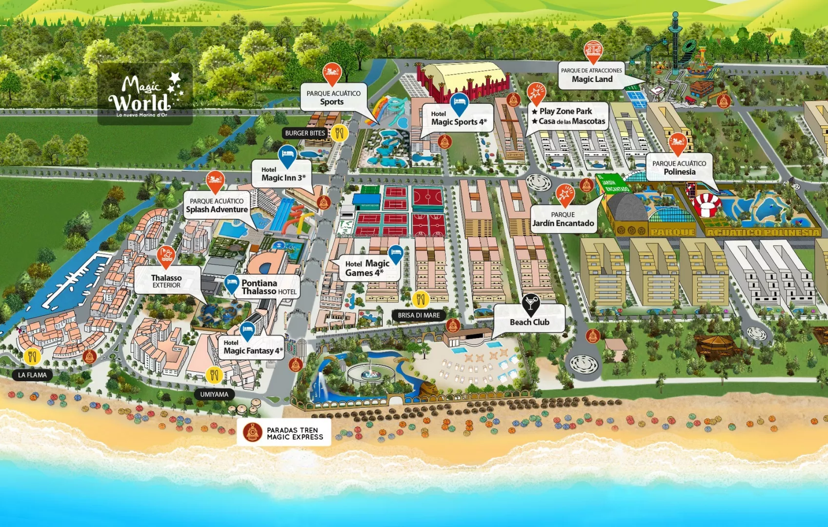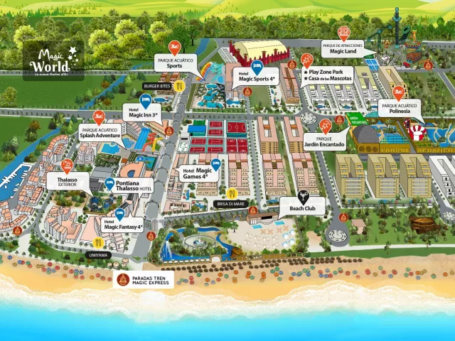 Užite si tematické parky Magic World, ktoré ponúkajú nepreberné možnosti zábavy, vzrušenia a dobrodružstva. Vstup do parkov môže byť spoplatnený alebo obmedzený podľa vybranej stravy a dĺžky pobytu. Vodný park Polinesia Tropický raj plný šmykľaviek, bazénov a vodných atrakcií v srdci Magic World Resortu. Nechajte sa preniesť do atmosféry Polynézie – od adrenalínových tobogánov cez rodinné bazény, lenivú rieku až po splash zóny pre najmenších. Niektoré atrakcie sú prístupné iba od určitého veku alebo výšky. Aquapark je v prevádzke od 19.6. do 5.9.2026. Lenivá rieka s vlnami a prúdmi Rýchle tobogány pre adrenalínových pretekárov Torbellino - tobogán, kde pocítite odstredivú silu Splash Zone a Froggy Pool - vodné ihrisko s niekoľkými bazénikmi Canal Play – vodná dráha pre tých najmenších Kúzelná záhrada Preneste sa do sveta snov a vstúpte do rozprávkovej záhrady plnej fantázie. Objavte malé škriatkov schovávajúce svoje poklady, víly tancujúce medzi okvetnými lístkami i múdre stromy, ktoré dokážu prehovoriť. Čaká vás veľkolepá šou, kde sa predstaví aj kúzelný jednorožec Rouge, jeden z maskotov Magic World Resortu. Zabavný park Magic Land Vstúpte do sveta adrenalínu a zábavy! Magic Land Park prináša vzrušenie aj radosť pre mladých, rodiny i najmenších dobrodruhov. Čaká vás voľný pád z výšky 37 metrov, hojdajúca sa vikingská loď, lanové centrum plné výziev, motokárová dráha, závodný tobogán aj kolotoč ako z rozprávky. A to je ešte len začiatok – objavte aj ďalšie atrakcie, ktoré premenia návštevu Magic Land Park na nezabudnuteľné dobrodružstvo. Lanzadera - voľný pád z 37 metrov Ship Vikingo – hojdajúca sa vikingská loď Mixtreme - lanové centrum s výzvami a zips-linky Karts – motokárová dráha Tobogán – závodná šmykľavka pre celú rodinu Carrousel – kolotoč ako z rozprávky Crazy Disk, Techno Jump, Turbo Force – atrakcia pre milovníkov adrenalínu Zona Game Experience – herná zóna pre celú rodinu Detské zóny - trampolíny, preliezky a zábava pre najmenších Herná zóna Magic Play Stlačte Play a zábava môže začať! Vstúpte do sveta hier, moderných technológií a digitálnych zážitkov. Čakajú na vás herné automaty plné videohier, virtuálna realita, tanečné súboje a adrenalínové preteky. Ideálne miesto pre každého, kto má rád interaktívne dobrodružstvo. Herné automaty – klasické aj moderné videohry a závodné simulátory Virtuálna realita – pohlcujúce zážitky a dobrodružné svety Tanečné súboje – hudobné a rytmické výzvy pre malých aj veľkých Adrenalínové preteky - súťaže, kde rýchlosť a reakcie rozhodujú Dom rozprávkových hrdinov Vitajte v mieste, kde ožívajú rozprávkové príbehy Magic World Resortu! Zoznámte sa s Malou morskou vílou, Poseidonom, neohrozeným kapitánom Hookom, kúzelným jednorožcom Rouge a mnohými ďalšími kamarátmi, ktorí vaše deti zavedú do sveta fantázie a radosti. Večerná show Magic World Užite si večery plné zábavy pre celú rodinu a nenechajte si ujsť niektoré z jedinečných predstavení. Čakajú vás kúzelnícke show, dych vyrážajúce akrobacie i muzikály, ktoré vás vtiahnu do sveta fantázie a emócií. Každé predstavenie prináša nové zážitky, ktoré okúzlia malých aj veľkých divákov. Pontiana Mediterraneo Thalasso Zregenerujte svoje telo aj myseľ a objavte kúzlo thalassa. Užívajte si blahodarné účinky morskej vody v relaxačnom bazéne s množstvom zákutí a masážnych trysiek, prípadne v niektorej z vyvýšených jacuzzi. V lete 2026 bude novo otvorená aj zrekonštruovaná vnútorná časť thalasso centra. Niektoré časti sú prístupné iba pre dospelých. Niektoré tematické parky sú otvorené iba počas letnej sezóny, a to od 19. 6. do 5. 9. 2026; potom sú uzavreté alebo v sú prevádzke iba vybrané dni.