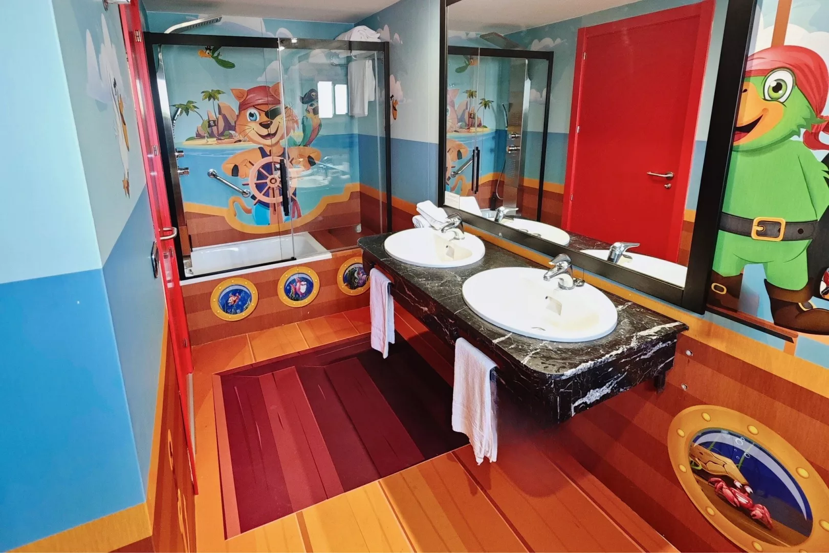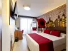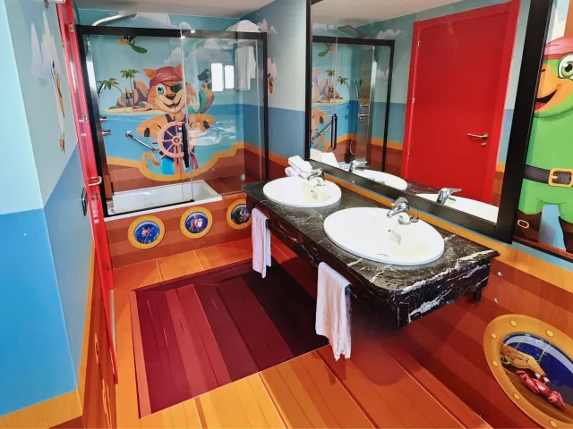 Dvojlôžková izba, Typ B tematicky dekorované izby s motívom dúhy, morskej víly, pirátov a mágie (rozdelenie izieb v kompetencii recepcie) klimatizácia kúpeľňa/WC (sušič vlasov) 1 lôžko široké 150 cm a poschodová posteľ pre deti TV/sat. minichladnička set na prípravu kávy alebo čaju trezor zadarmo balkón detská postieľka zdarma (na vyžiadanie; postieľka je riešená formou zábrany pri dolnom lôžku poschodovej postele) 21 m2 Ostatné typy izieb (pokiaľ nie je uvedené inak, majú izby vyššie uvedené vybavenie) Premium izby – klienti navyše čerpajú dodatačné služby PREMIUM Služby PREMIUM kávovar Nespresso VIP recepcia VIP oddelená časť hlavnej reštaurácie VIP oddelená časť pri bazéne prednostný front vo vybraných baroch zľava vo wellness centre Typ A : kapacitne obmedzená ponuka za zvýhodnenú cenu, vybavenie izieb je rovnaké ako Typu B