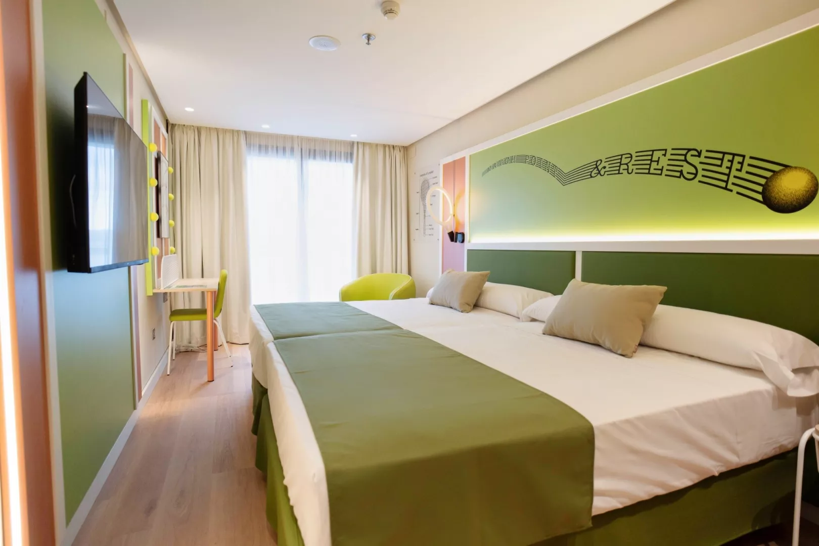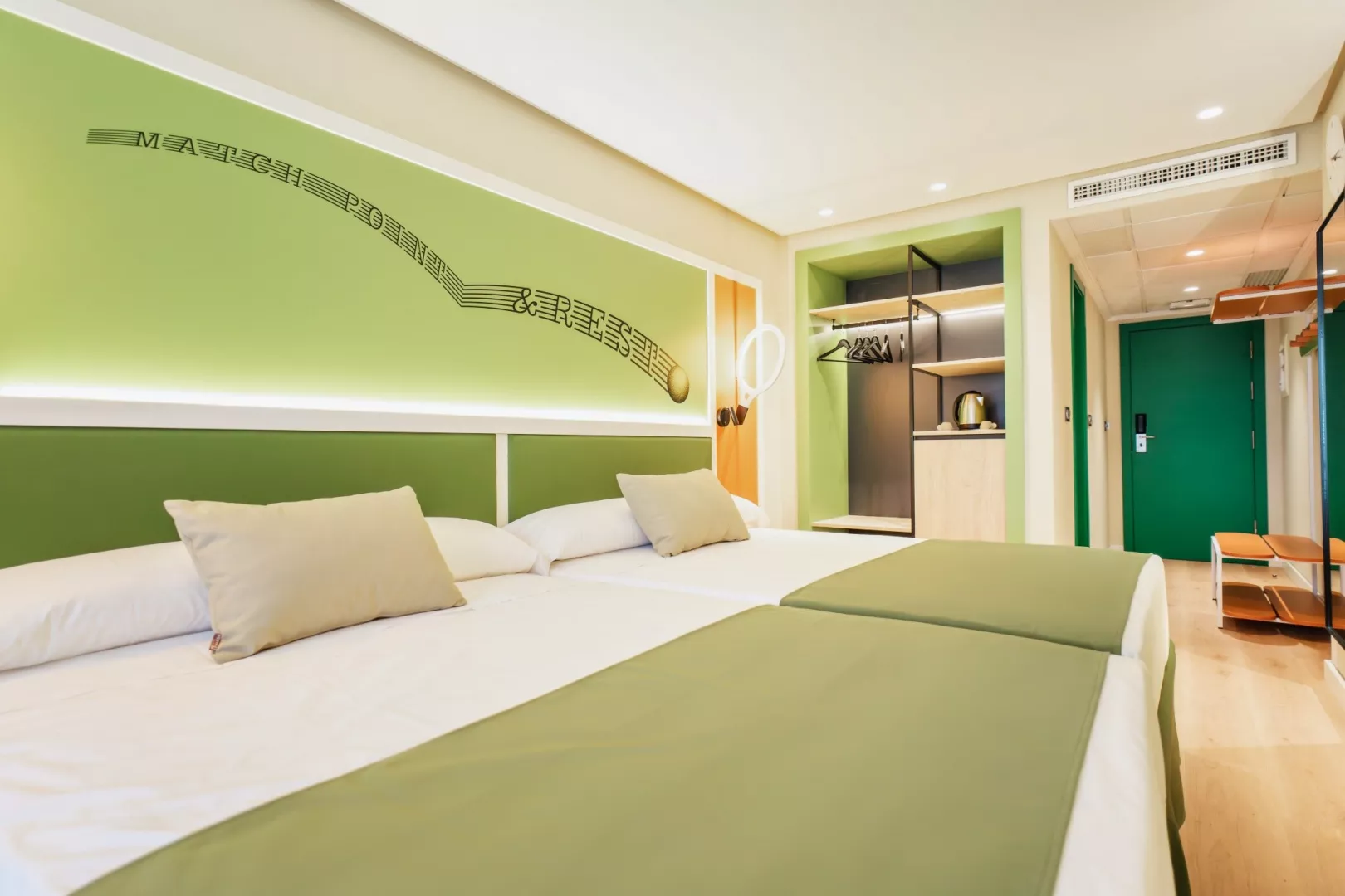 Dvojlôžková izba, Typ B tematicky dekorované izby so športovými motívom (rozdelenie izieb v kompetencii recepcie) klimatizácia kúpeľňa/WC (sušič vlasov) 2 lôžka široké 135 cm, v prípade obsadenosti 5 osoba navyše pohovka TV/sat. minichladnička set na prípravu kávy alebo čaju trezor zadarmo balkón detská postieľka za poplatok (na vyžiadanie) 22 m2 Ostatné typy izieb (pokiaľ nie je uvedené inak, majú izby vyššie uvedené vybavenie) Premium izby – klienti navyše čerpajú dodatačné služby PREMIUM Služby PREMIUM kávovar Nespresso VIP recepcia VIP oddelená časť hlavnej reštaurácie VIP oddelená časť pri bazéne prednostný front vo vybraných baroch zľava vo wellness centre Typ A : kapacitne obmedzená ponuka za zvýhodnenú cenu, vybavenie izieb je rovnaké ako Typu B