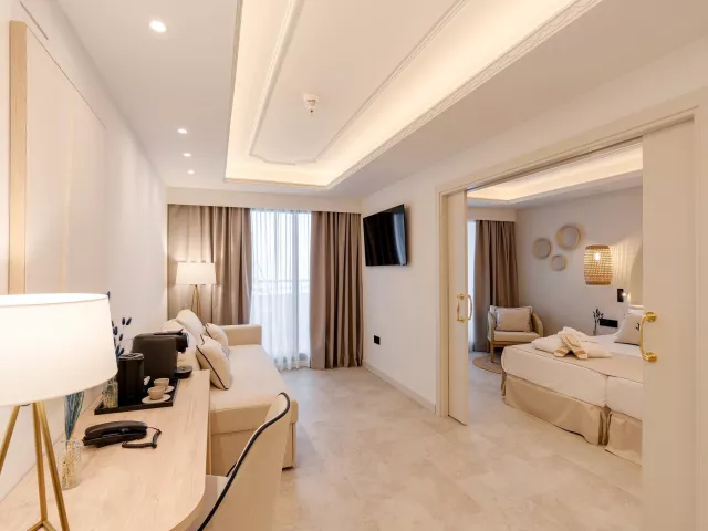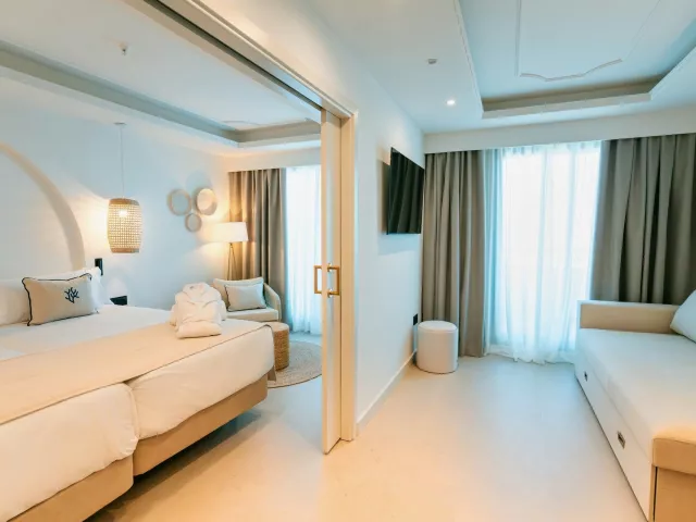 Dvojlôžková izba, Typ B klimatizácia kúpeľňa/WC (sprcha, sušič vlasov) 2 lôžka široké 105 cm alebo 135 cm v závislosti od osadenosti izby; prístelka nie je možná TV/sat. minichladnička set na prípravu kávy alebo čaju trezor zadarmo balkón detská postieľka za poplatok (na vyžiadanie) Ostatné typy izieb (pokiaľ nie je uvedené inak, majú izby vyššie uvedené vybavenie) Dvojposteľová izba, Výhľad mora, Typ B - balkón s výhľadom na more Junior Suite, 1 spálňa, Typ B - sprcha aj vaňa, oddelená spálňa, 40 m2, 2 lôžka široké 105 cm, obývacia časť s pohovkou (1 lôžko); prístelka nie je možná Premium izby – klienti navyše čerpajú dodatačné služby PREMIUM Služby PREMIUM kávovar Nespresso VIP recepcia VIP oddelená časť hlavnej reštaurácie VIP oddelená časť v Pontiana Mediterranean Thalasso VIP oddelená časť pri bazéne prednostný front vo vybraných baroch zľava vo wellness centre Typ A : kapacitne obmedzená ponuka za zvýhodnenú cenu, vybavenie izieb je rovnaké ako Typu B