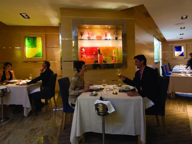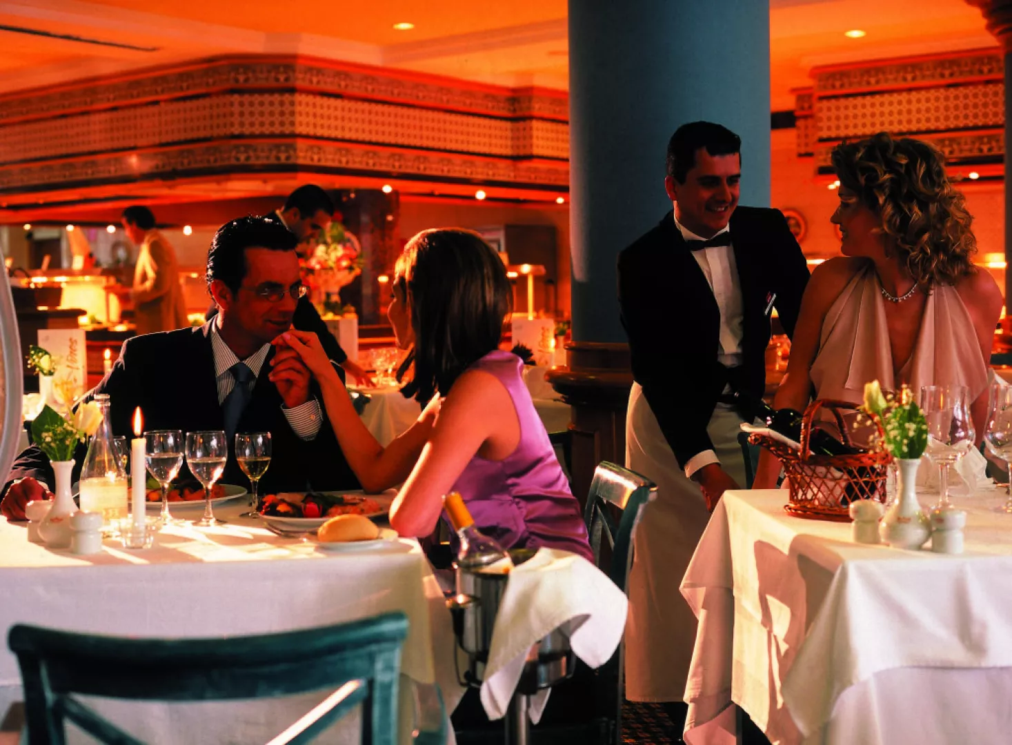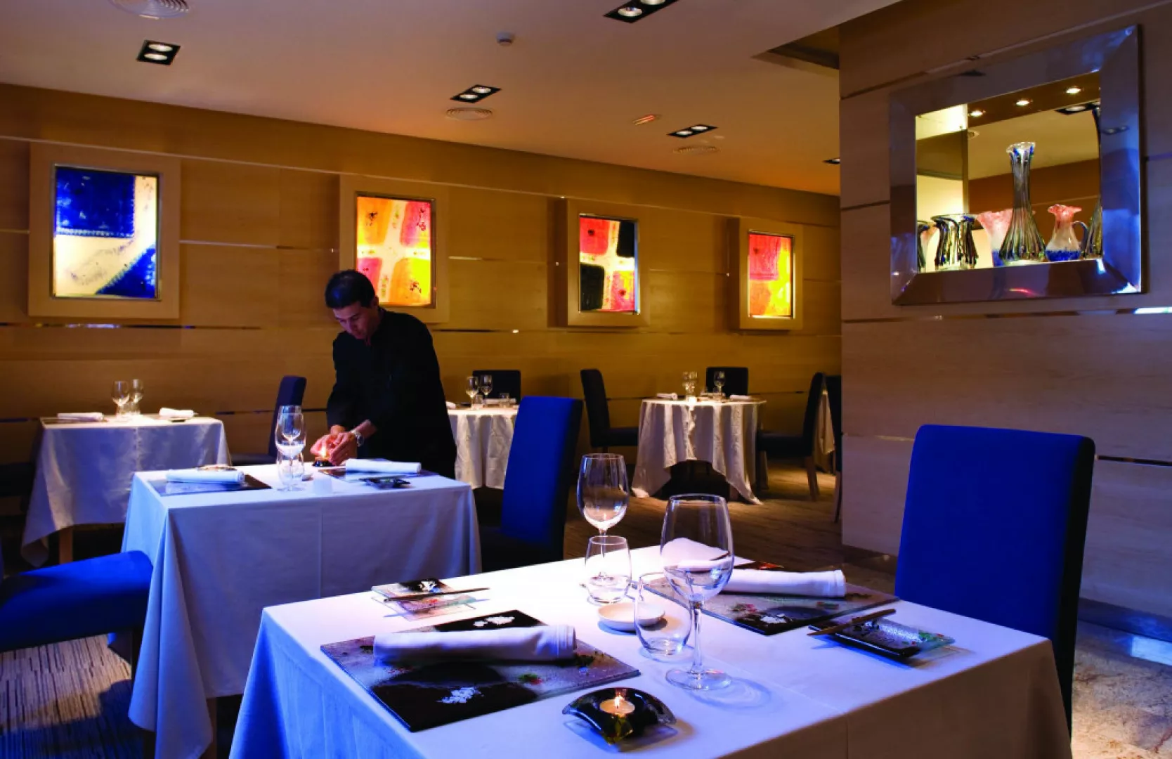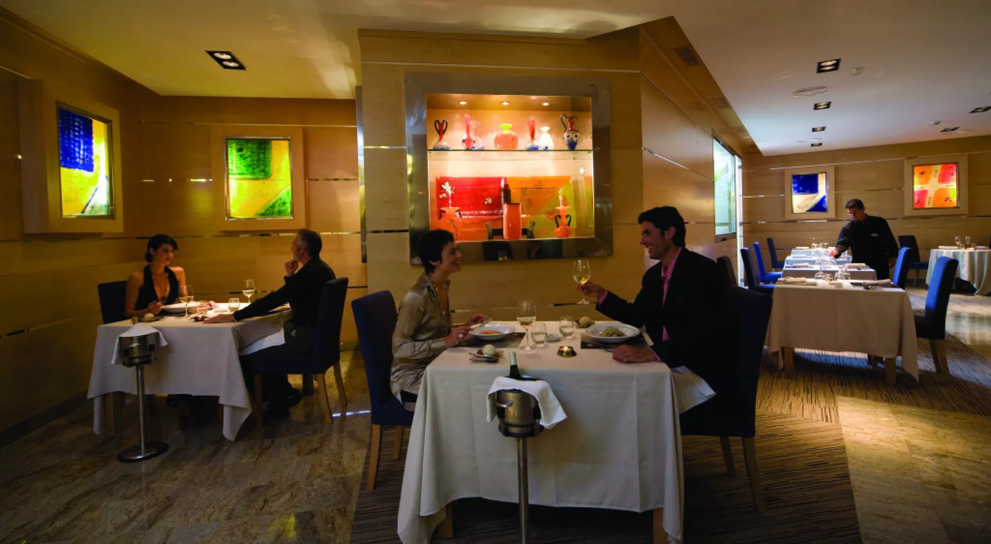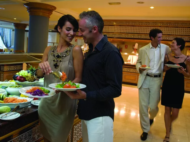 All-inclusive a polpenzia je k dispozícii na vyžiadanie • Hlavná reštaurácia Raňajky: Rozmanité bufetové raňajky s cooking station a na vyžiadanie aj s vínom šampanským. Večera: Studené a teplé bufetové jedlá, čerstvé špeciality pripravované na cooking station, dezertový bufet. Možnosť vegetariánskeho menu. Tematické bufetové večere (dvakrát týždenne) Obed: À la carte ponuka, tapas bar pri bazéne. Pre hostí all-inclusive bufetová obsluha, cooking station a výber dezertov. Oblečenie: Pánom sa odporúča nosiť na večeru dlhé nohavice. • Krystal Fúzny reštaurácia, potrebná rezervácia Kombinácia klasickej a medzinárodnej kuchyne • Nápoje: miestne a vybrané importované nápoje sú k dispozícii v baroch a reštauráciách hotela do 01:00 hod.
