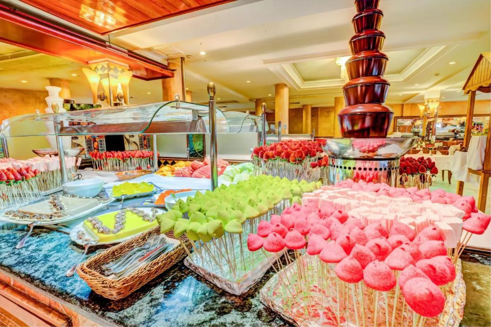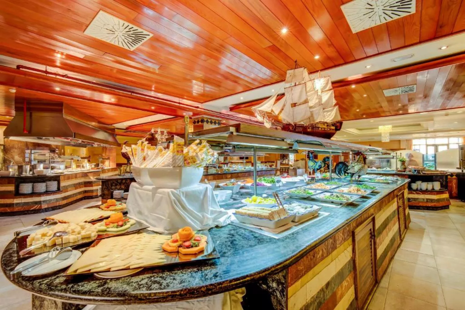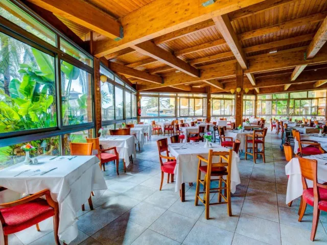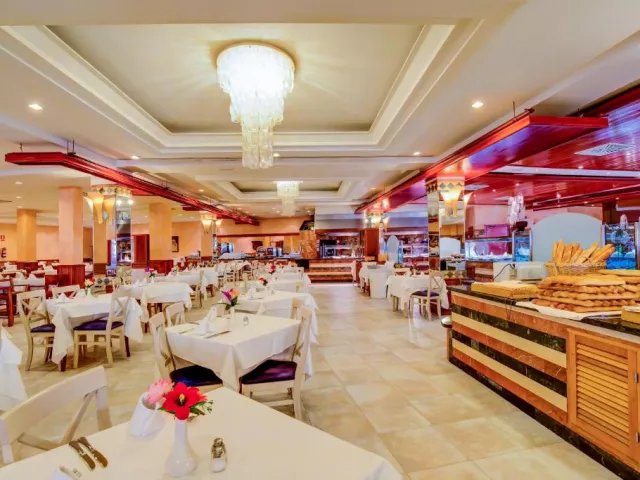 • Bufetová reštaurácia: V hlavnej bufetovej reštaurácii môžete ochutnať lahodnú medzinárodnú kuchyňu, ktorá Vám ponúka rôzne jedlá z mäsa a rýb, ovocie, šaláty a vynikajúce dezerty. Výdatné raňajky a na obed i večeru, čerstvo pripravené grilované ryby alebo jedlá z mäsa. • Bufet La Cabaña: Nachádza sa vedľa jedného z hotelových bazénov a ponúka široký výber nápojov, ľahkých jedál, ako aj kávu, čaj a rôzne pečivá. Poznámka: Žiadame pánov, aby si na večeru obliekli dlhé nohavice! • Bufet La Choza: Nachádza sa vedľa jedného z hotelových bazénov a ponúka široký výber nápojov, ľahkých jedál, kávu, čaj, ale aj široký výber lahodného pečiva. • Garbi bar salón: Tento bar ponúka osvieženie a príjemnú večernú atmosféru. Vyskúšajte niektorý z rôznych exotických nápojov, sledujte naše večerné zábavné programy! • Pool bar: Nachádza sa v strede hlavného bazéna a jeho privilegovaná poloha Vám umožní vychutnať si osviežujúce nápoje počas prestávky pri bazéne. • Bar Salon Cofete