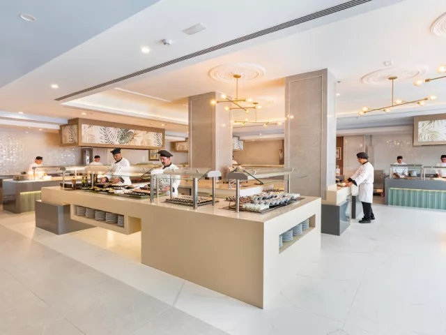 Kuchári hotela Vám pripravia tie najlepšie jedlá. V každej reštaurácii na Vás čaká skutočný kulinársky zážitok. Raňajky a večere sa podávajú formou švédskych stolov, s čerstvo pripravenými jedlami, najlepšími jedlami fusion kuchyne a majstrovskými dielami španielskej kuchyne. Ak máte na večeru špeciálne priania, môžete si na recepcii objednať svoje obľúbené jedlo. RAŇAJKY: Pestré raňajky formou švédskych stolov, kde sa podáva aj šampanské! VEČERA: • Studené a teplé predjedlá formou bufetu. • Široký výber bufetových hlavných jedál, čerstvo pripravené jedlá. • bufet s dezertmi. Tematické večere (dvakrát týždenne). Poznámka: Prosíme našich milých hostí, aby nosili počas večere dlhé nohavice!