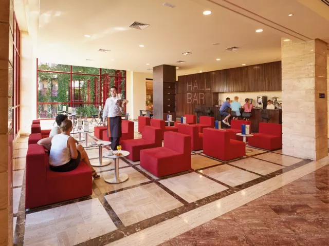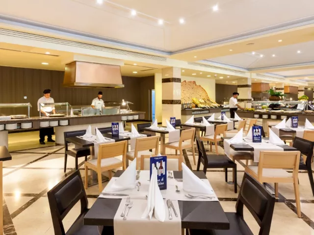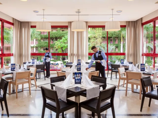 V hlavnej hotelovej reštaurácii si môžete každý deň vychutnať jedlá s inou tematikou. Služby All inclusive: Stravovanie: raňajky, obedy a večere formou bufetu. Neobmedzené občerstvenie, tapas, studené jedlá, koláče a ovocie od 10:00 do 18:30. V rámci služby All Inclusive je možné neobmedzene konzumovať hamburgery, pizze, hotdogy, sendviče, hranolky a šaláty do 16:30. Konzumácia neobmedzeného množstva miestnych nápojov a nealkoholických nápojov (pivo, víno, sangria, gin, vodka, rum, whisky, brandy a likéry, čaje, káva, minerálka, ovocné šťavy) je možné v čase od 10:00 do 24:00 hod. Za niektoré zahraničné nápoje sa môže účtovať príplatok. Zmrzliny sú k dispozícii od 10:30 do 18:30.