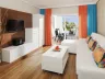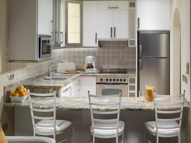 • 1-spálňový apartmán s terasou Rozloha apartmánu: 45 m² Výhľad: záhrada Vybavenie: Jednoizbové terasové apartmány sa väčšinou nachádzajú na prízemí alebo prvom poschodí. Každý má plne vybavenú kuchyňu a zariadenú terasu. V spálni je veľká šatníková skriňa a dve samostatné postele, ktoré je možné na požiadanie spojiť do manželskej postele veľkosti king. V obývacej izbe je rozkladacia pohovka pre 2 osoby. V kúpeľni je WC, bidet a sprchovací kút. Nad umývadlom je k dispozícii pevný fén. • 1-spálňový apartmán Rozloha apartmánu: 30 m² Výhľad: bazén alebo more Jednospálňové apartmány s výhľadom na more sa väčšinou nachádzajú na druhom alebo najvyššom poschodí. Každý má plne vybavenú kuchyňu a zariadenú terasu. V spálni je veľká šatníková skriňa a dve samostatné postele, ktoré je možné na požiadanie spojiť do manželskej postele veľkosti king. V obývacej izbe je rozkladacia pohovka pre 2 osoby. V kúpeľni je WC, bidet a sprchovací kút. Nad umývadlom je k dispozícii pevný fén. • 2-spálňový apartmán s výhľadom Rozloha apartmánu: 60 m² Výhľad: more 2-spálňové apartmány s výhľadom na more sa väčšinou nachádzajú na druhom alebo najvyššom poschodí. Každý má plne vybavenú kuchyňu a zariadenú terasu. Hlavná spálňa má 2 samostatné lôžka, ktoré možno na požiadanie spojiť a vytvoriť z nich manželskú posteľ veľkosti king. Druhá spálňa má dve samostatné postele. V obývacej izbe je rozkladacia pohovka pre 2 osoby. V kúpeľni je WC, bidet a sprchovací kút. Nad umývadlom je k dispozícii pevný fén.