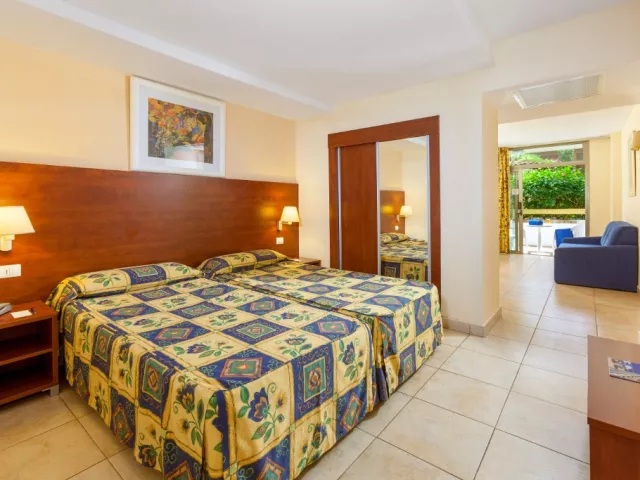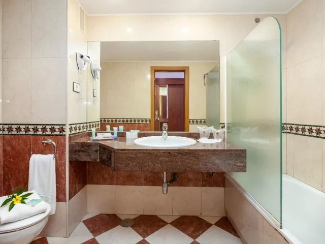 • Štandardná izba Rozloha izby: 25 m2 Výhľad: mesto Vybavenie: 2 samostatné manželské postele, balkón alebo terasa, minibar (za príplatok), trezor, klimatizácia, Wi-Fi, SAT TV s plochou obrazovkou, sušič vlasov, telefón na pevnú linku, písací stôl • Izba s výhľadom na bazén Rozloha izby: 25 m2 Výhľad: bazén Kapacita: max. 3 dospelí + 1 dieťa (2-12 rokov) Vybavenie: 2 samostatné manželské postele, balkón alebo terasa, minibar (za príplatok), trezor, klimatizácia, Wi-Fi, SAT TV s plochou obrazovkou, sušič vlasov, telefón na pevnú linku, písací stôl • Izba Senator Rozloha izby: 25 m2 Výhľad: mesto Vybavenie: 2 samostatné manželské postele, balkón alebo terasa, minibar (za poplatok), trezor, klimatizácia, Wi-Fi, SAT TV s plochou obrazovkou, sušič vlasov, župan, papuče, telefón na pevnú linku, písací stôl Izby sa nachádzajú na vyšších poschodiach (4,5,6) a majú priamy prístup na prémiovú terasu (len pre dospelých). • Izba Senator s výhľadom na bazén Rozloha izby: 25 m2 Výhľad: bazén Vybavenie: 2 oddelené manželské postele, balkón alebo terasa, minibar (za poplatok), trezor, klimatizácia, Wi-Fi, SAT TV s plochou obrazovkou, sušič vlasov, župan, papuče, telefón na pevnú linku, písací stôl Izby sa nachádzajú na vyšších poschodiach (4,5,6) a majú priamy prístup na prémiovú terasu (len pre dospelých).