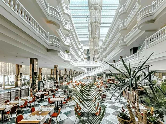 Cleopatra Palace bufetová reštaurácia: Raňajky a večere formou bohatých švédskych stolov. V ponuke sú miestne a medzinárodné špeciality, tematické večere, tzv. showcooking (príprava jedál pred očami hostí). Raz za týždeň sa môžete zúčastniť Gala večere, kde Vás čaká živá hudba a špeciálne luxusné bufetové stoly. Raňajky: od 07,00 do 10,30 hod. Večere: v lete od 19,30 do 22,30 hod, v zime od 19,00 do 22,00 hod. VIP Pool Lounge: Oddýchnite si bazéne v sprievode skvelých jedál a nápojov. Snack Marco Antonio: Terasa pri rímskom bazéne v príjemnom prostredí ponúka šaláty, hamburger, cestoviny, pizzu a detské menu. Otváracia doba: od 10,30 do 18,30 hod Bar Hall: Bar nájdete oproti recepcii, kde si môžete vychutnať svoj obľúbený nápoj pri počúvaní klavírnej hudby. Otváracia doba: 17:00-24:00 Hra na klavíry: 20:15-23:00