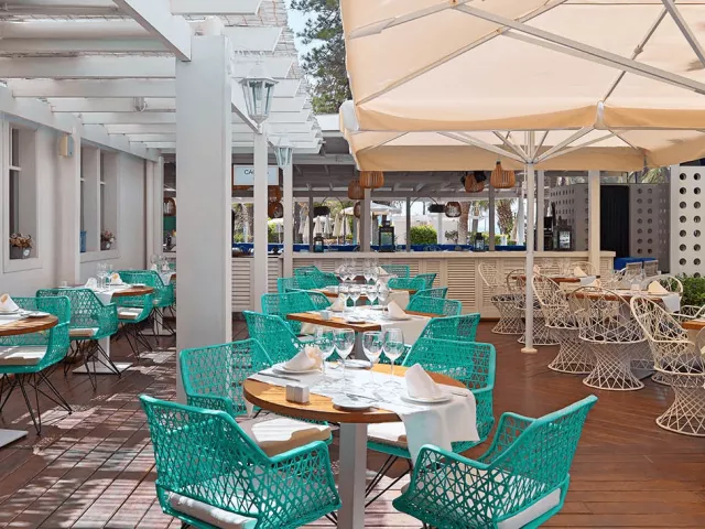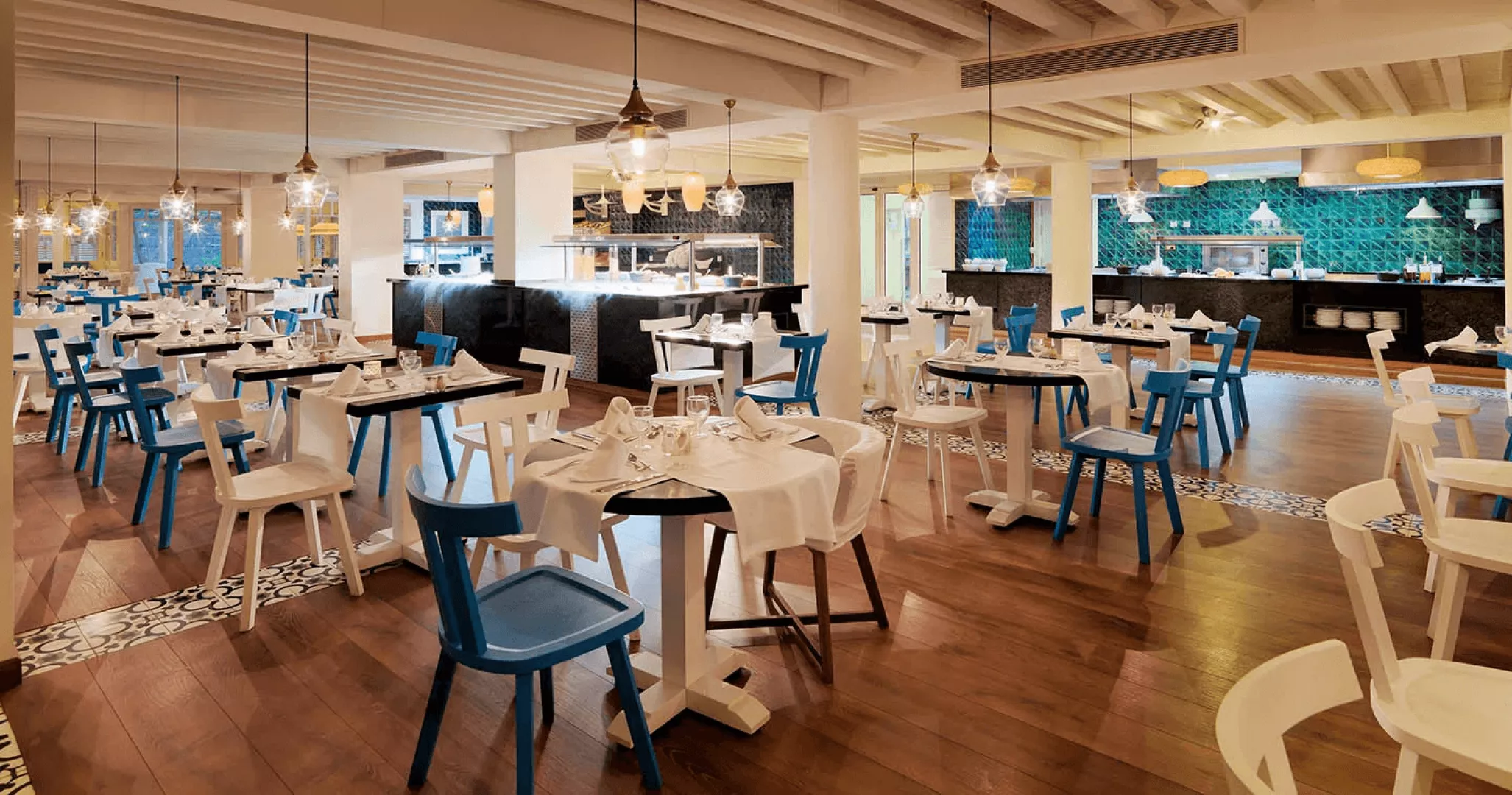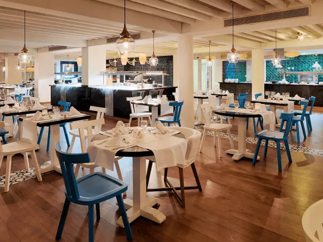 Hotel má hlavnú reštauráciu Blue Bay, ktorá ponúka raňajky a večere formou bufetu s prípravou jedál pred očami návštevníkov. Ďalej obsahuje à la carte reštauráciu Naturalia, zameranú na stredomorské jedlá a čerstvé suroviny, a reštauráciu Blue Bay Night s ponukou večerí na terase s výhľadom na more. K dispozícii je aj Cactus Bar pri bazéne, špecializujúci sa na kokteily a ľahké občerstvenie, a kaviareň Mike's Coffee s terasou.