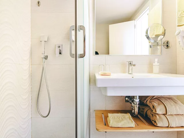 Apartmán, Street View klimatizácia TV kúpeľňa/WC (sušič vlasov) Wi-Fi zadarmo 34 m2 oddelená spálňa obývacia izba s dvoma sofa beds kuchynský kút (sporák, chladnička, mikrovlnná rúra) trezor (za poplatok) balkón Ostatné typy izieb (pokiaľ nie je uvedené inak, majú izby vyššie uvedené vybavenie) Apartmán, Výhľad záhrada - kúpelňa so sprchou, výhľad do záhrady Apartmán Plus, Výhľad jazero - novo renovovaný apartmán, na vyšších poschodiach, župany po celú dobu pobytu zdarma, kúpeľňa so sprchou a hlavovou sprchou, výhľad na jazero Apartmán Plus, Výhľad mora - novo renovovaný apartmán, na vyšších poschodiach, župany po celú dobu pobytu zdarma, kúpeľňa so sprchou a hlavovou sprchou, výhľad na more Štúdio - 22m2, strana do ulice
