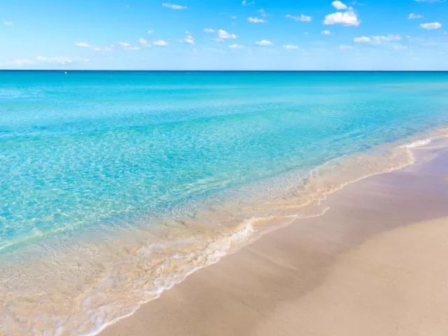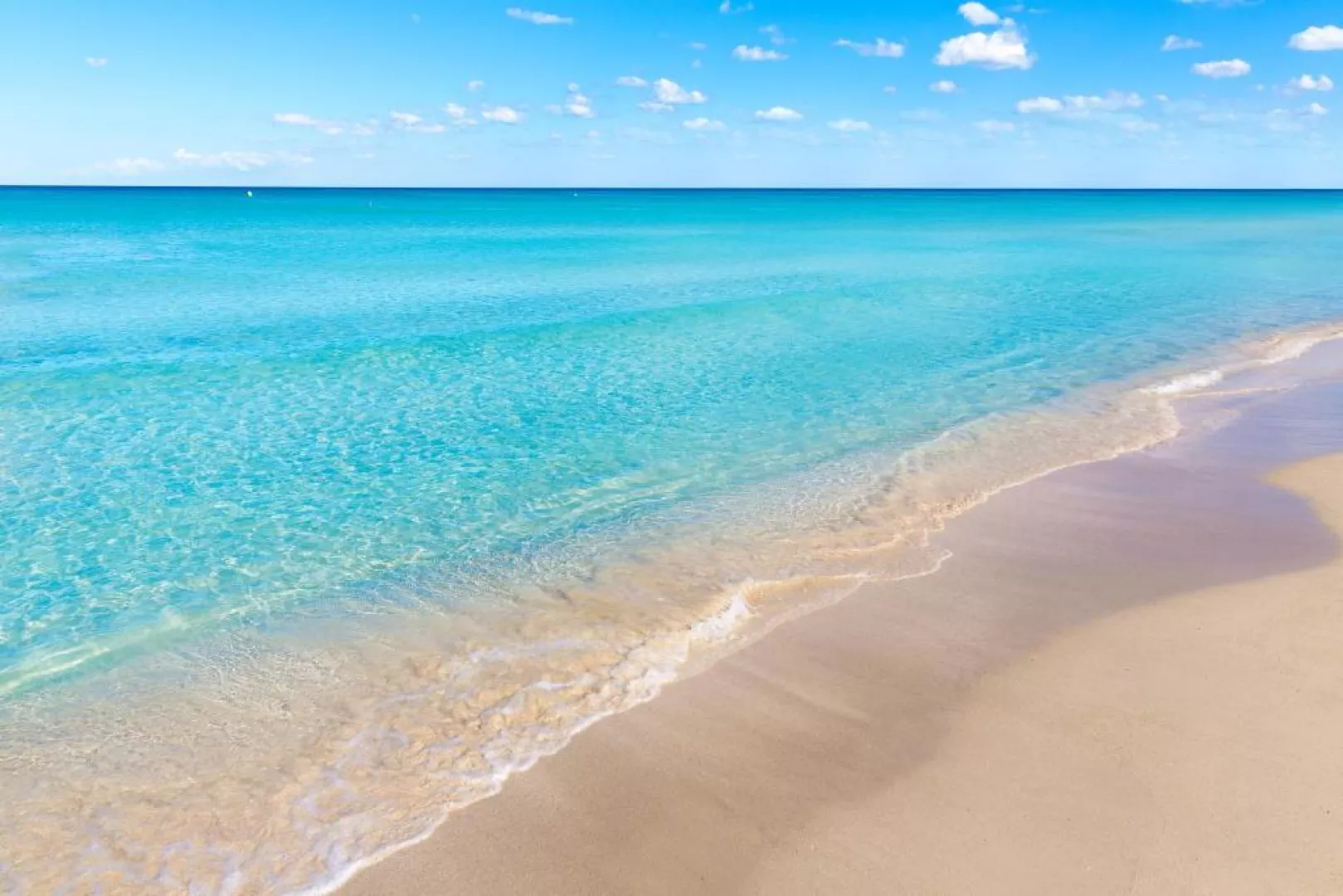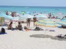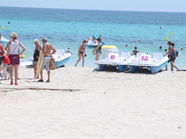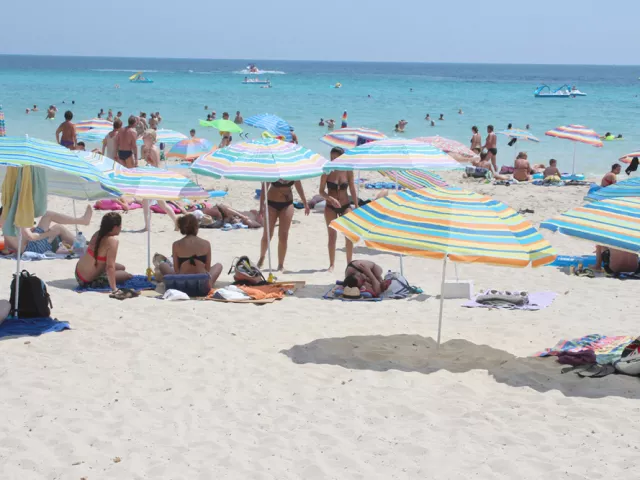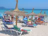 dlhá, piesočnatá pláž s pozvoľným vstupom do mora, ležadlá a slnečníky (za poplatok),