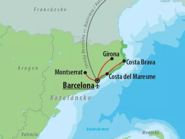 1. deň: Prílet do Barcelony a transfer do hotela na pobreží Costa Brava alebo Costa del Maresme, kde sa ubytujete. Obe lokality sú známe krásnymi piesočnatými plážami a turistickými chodníčkami.